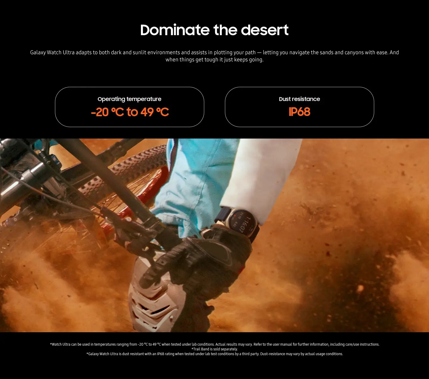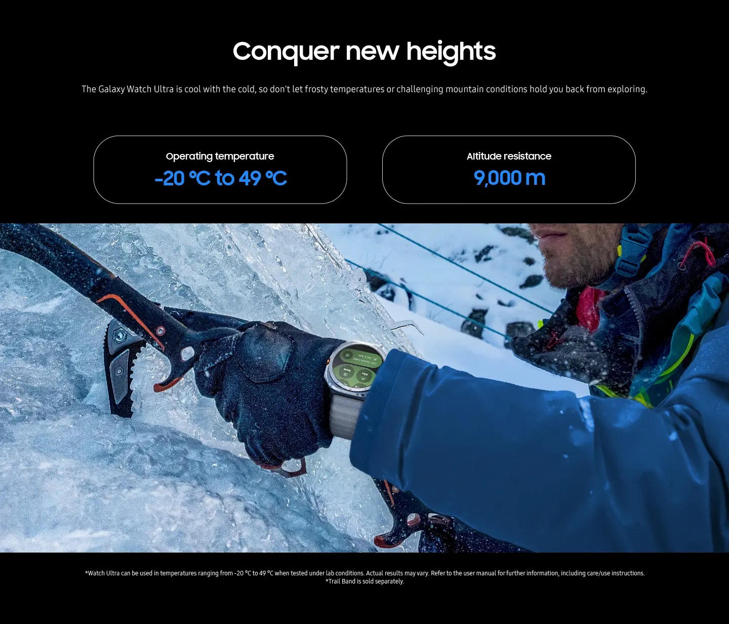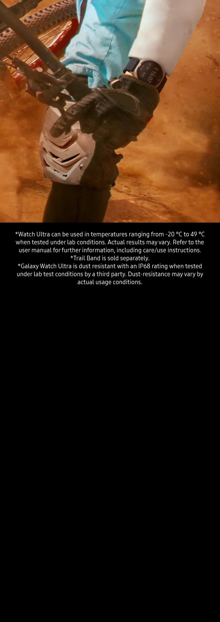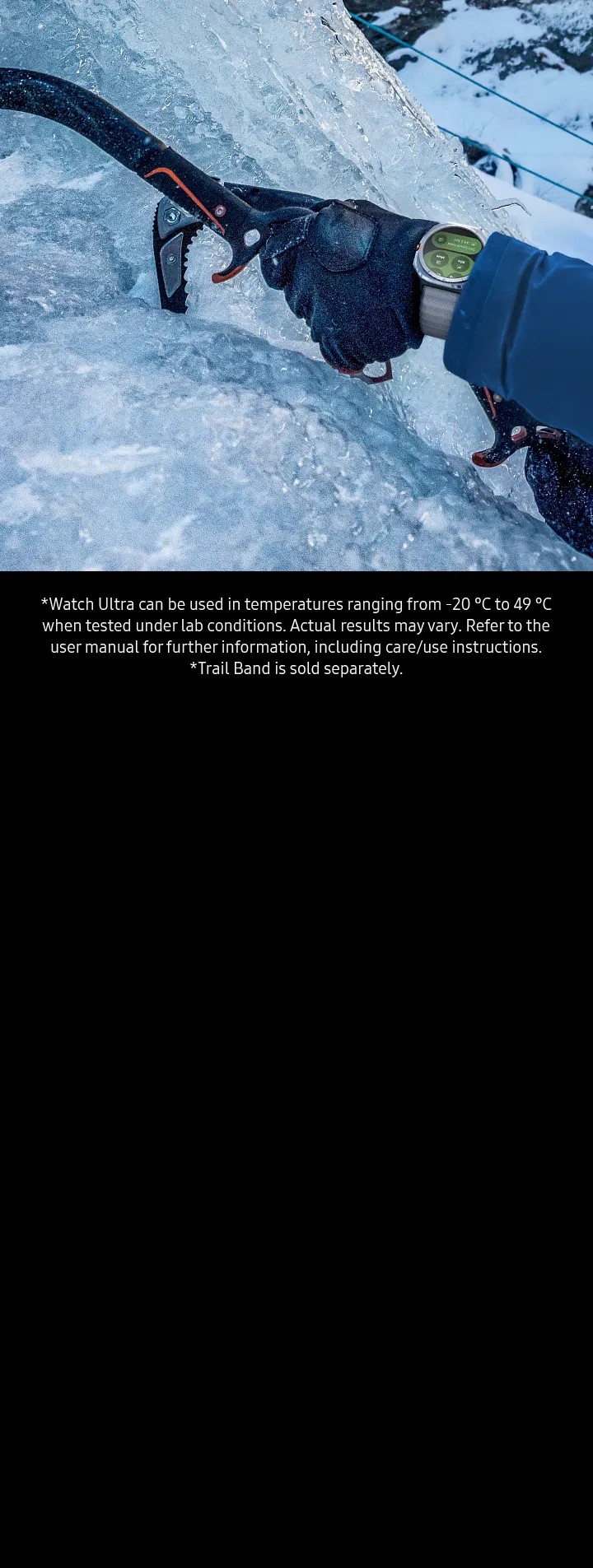 Ultra precise, ultra intelligent, ultra long-lasting. Watch Ultra is powered by a strong battery and features next-gen Galaxy AI technology. With dual-frequency GPS for pinpoint location accuracy and advanced analytics it’s the ultimate outdoor companion. Enjoy a whole new understanding of your wellness with an Energy Score from Galaxy AI. Watch Ultra consolidates your biodata, providing valuable insights to your recovery and activity readiness through personalised Wellness Tips and Heart Rate Zones. Log your performance from city, to sand, to summit with round-theclock advanced analytics. With multisports modes for all types of terrain and intuitive sleep monitoring, Watch Ultra tracks your health – even with your eyes closed. Access a suite of data tools by pairing Watch Ultra with the Samsung Health app. Get real-time feedback on your activity and log calories burned, macronutrients, caffeine intake and more to build healthy habits.