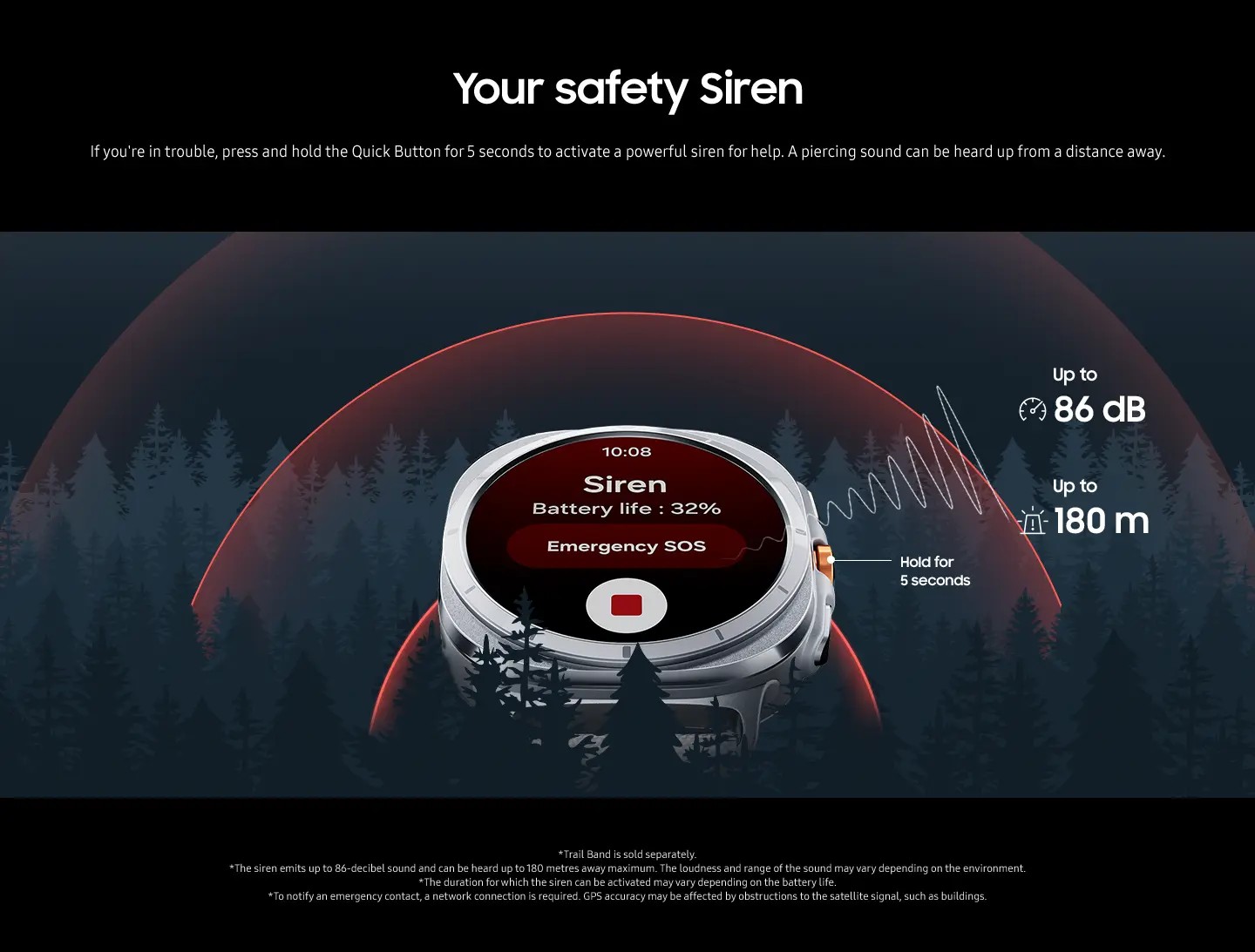 - Built-in emergency siren and customisable action button for outdoor safety and convenience