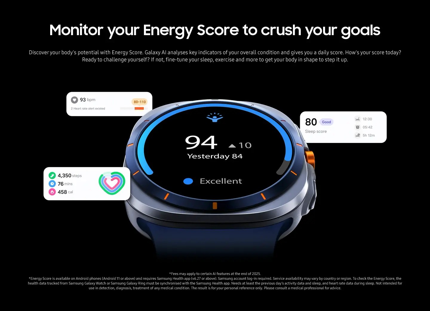 - Ultra-intelligent coaching with Galaxy AI, Energy Score, Heart Rate Zones, and personalised Wellness Tips