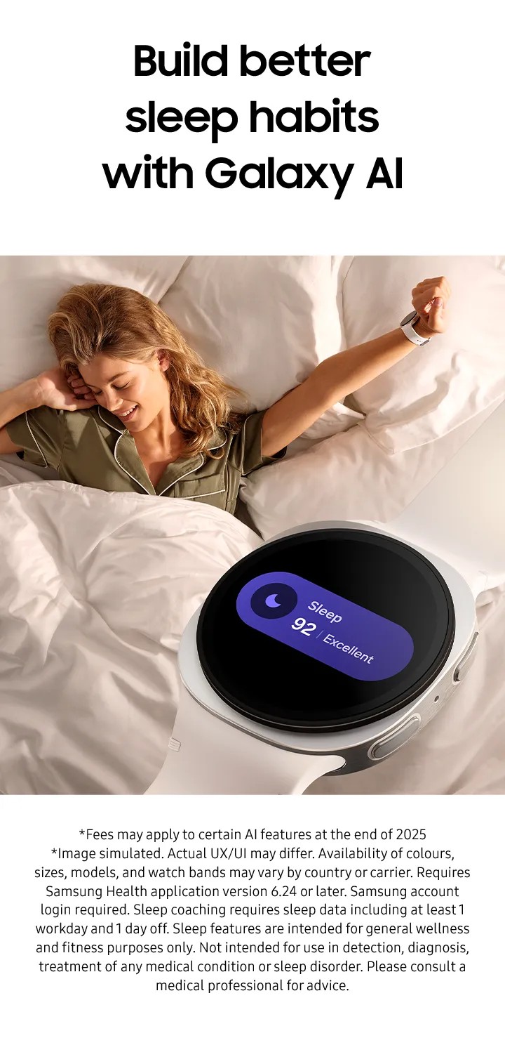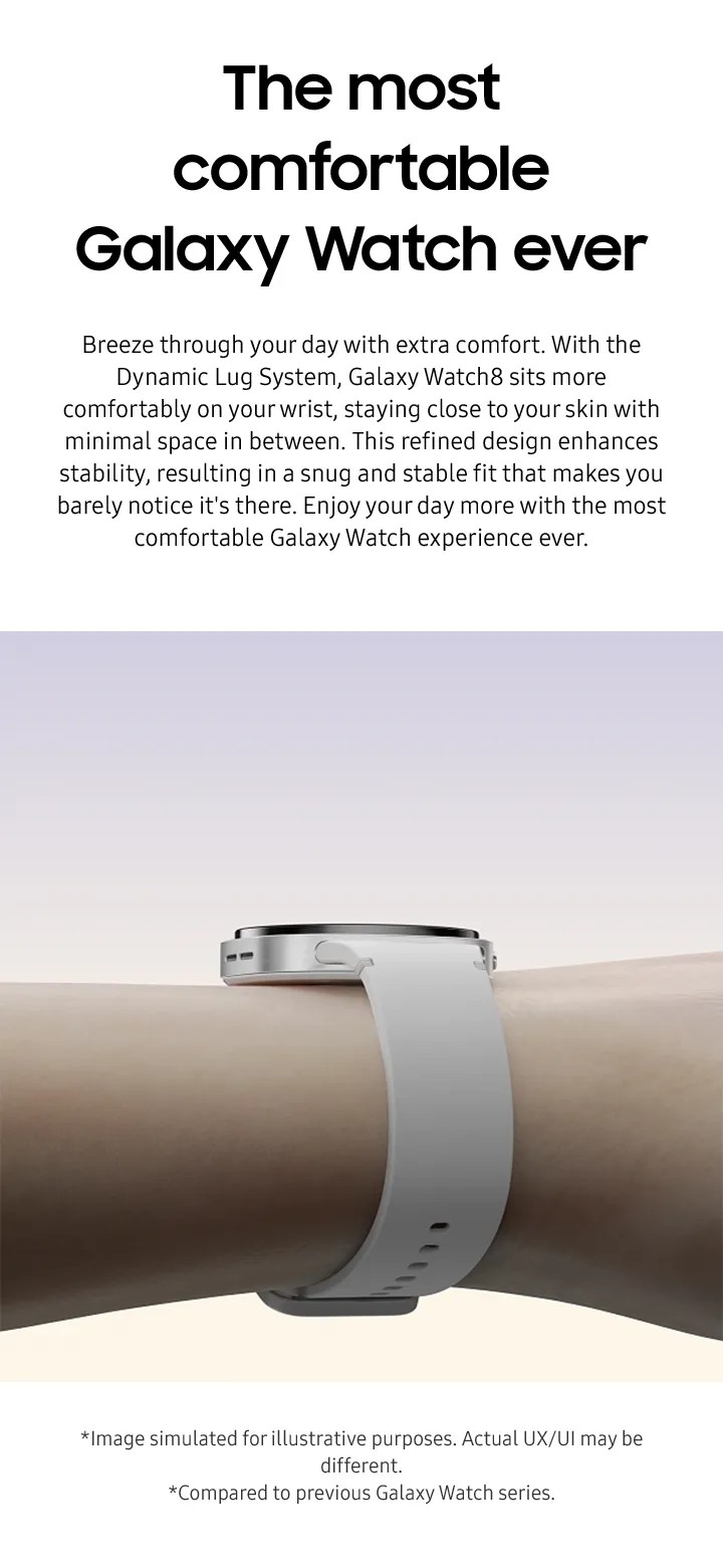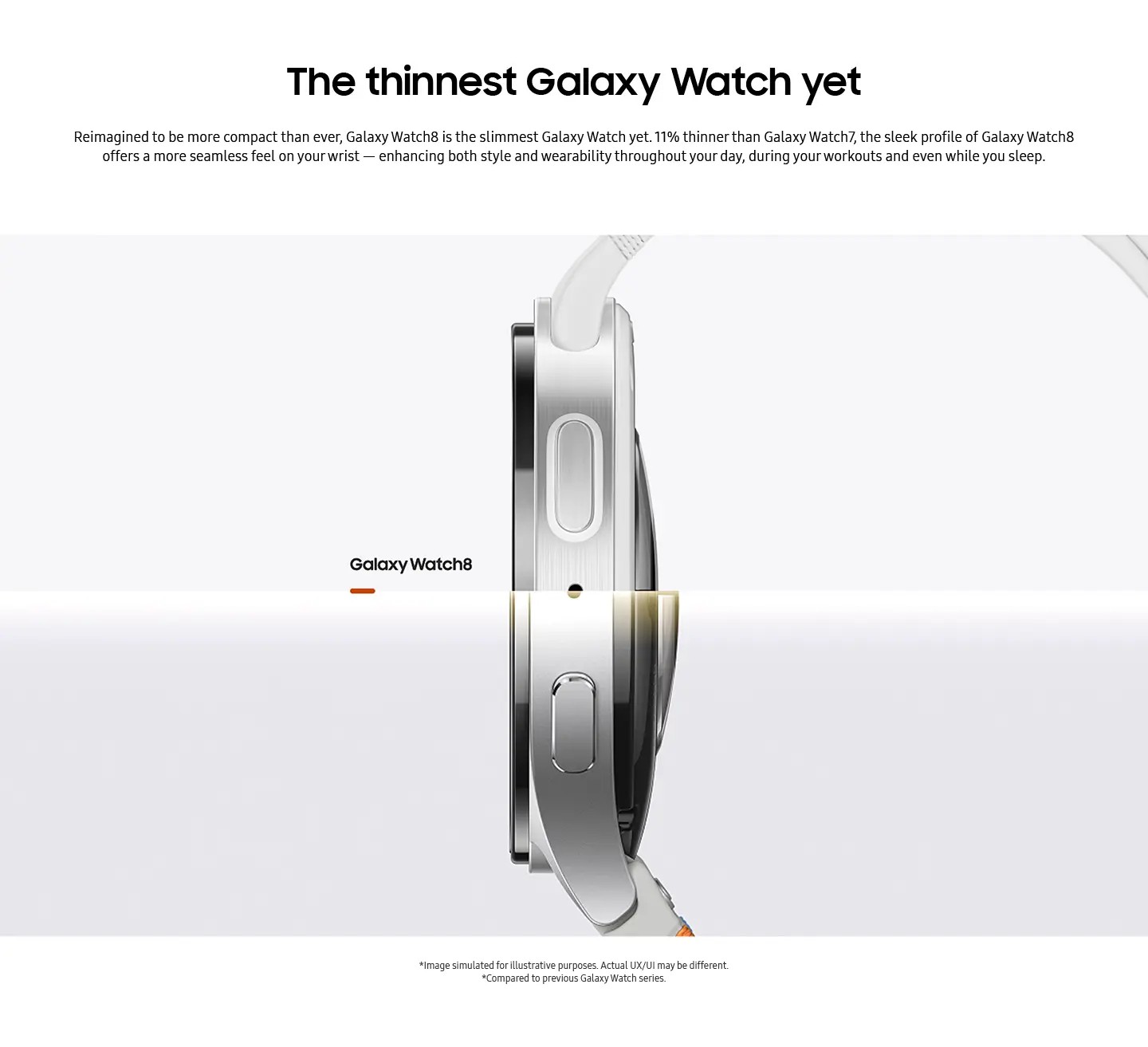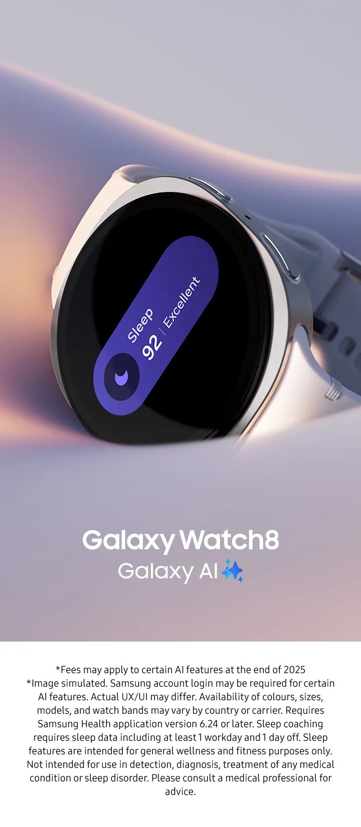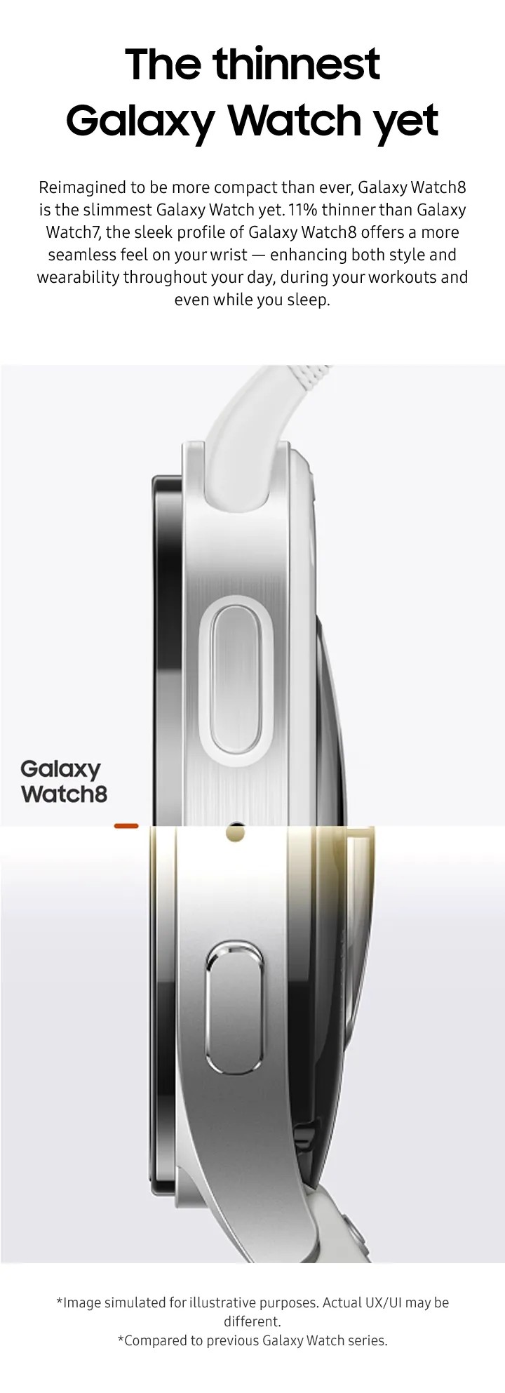 Take control of your wellness with the latest in AI-powered tracking and insights. From smarter workout analysis to intelligent sleep tracking and in-depth insights, you’ll get personalised suggestions, actionable Wellness Tips, and a daily Energy Score – all designed to turn your data into real, everyday impact. It's not just tracking – it’s your wellness story, redefined. Featuring Samsung’s thinnest design ever, enhanced comfort, and a vibrant sapphire crystal display, the Galaxy Watch8 is built to move with you, day and night.