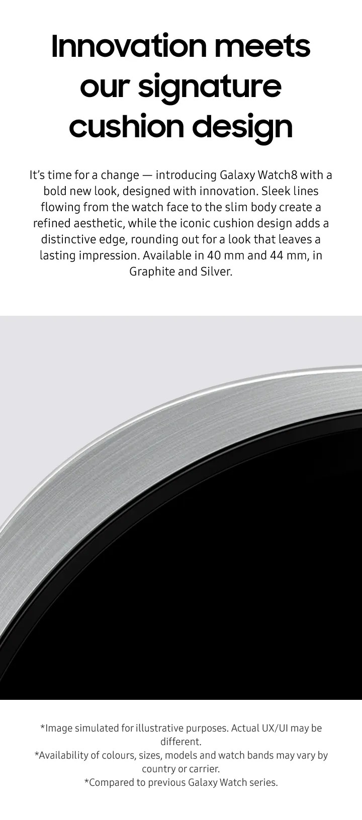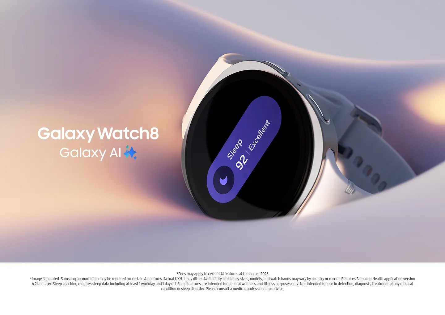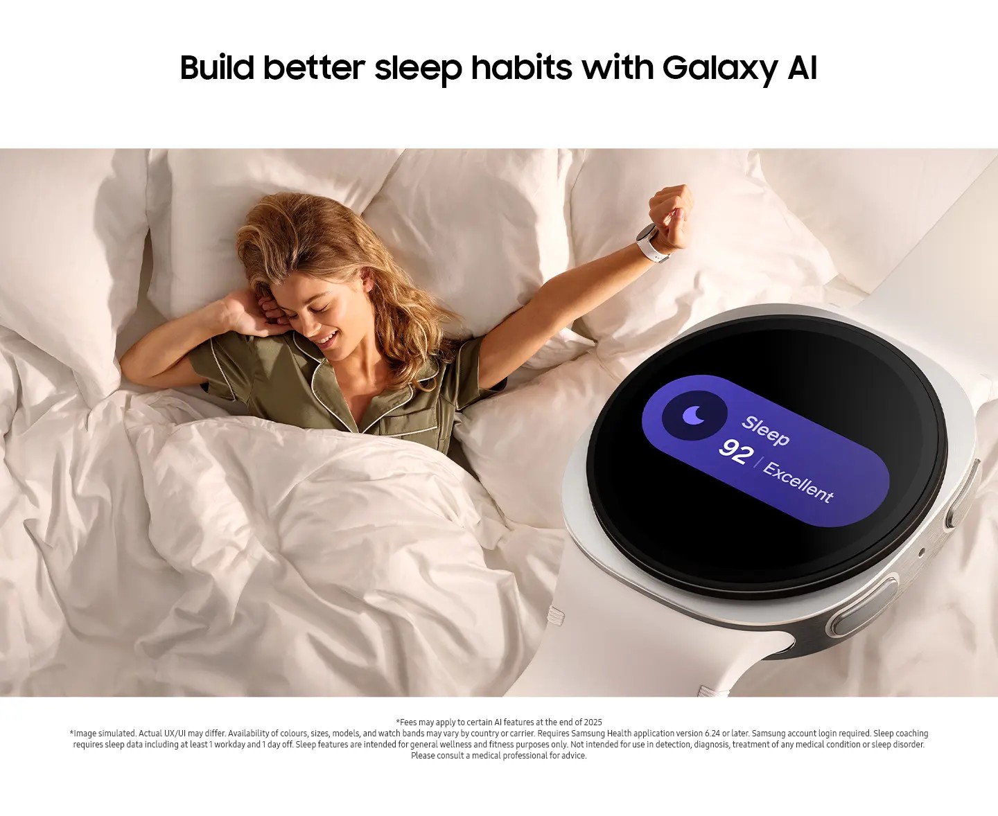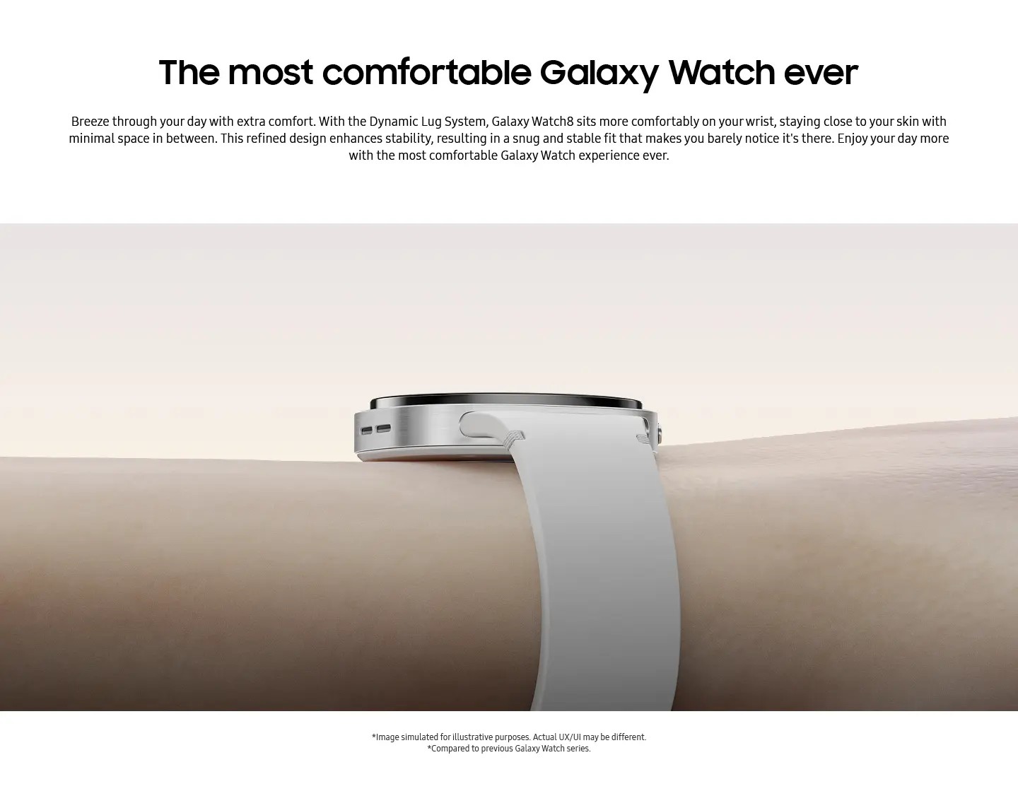 Take control of your wellness with the latest in AI-powered tracking and insights. From smarter workout analysis to intelligent sleep tracking and in-depth insights, you’ll get personalised suggestions, actionable Wellness Tips, and a daily Energy Score – all designed to turn your data into real, everyday impact. It's not just tracking – it’s your wellness story, redefined. Featuring Samsung’s thinnest design ever, enhanced comfort, and a vibrant sapphire crystal display, the Galaxy Watch8 is built to move with you, day and night.
