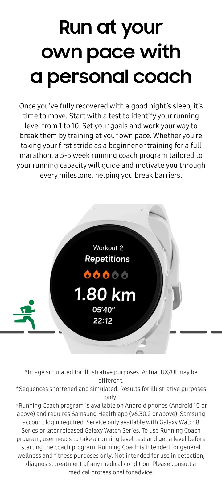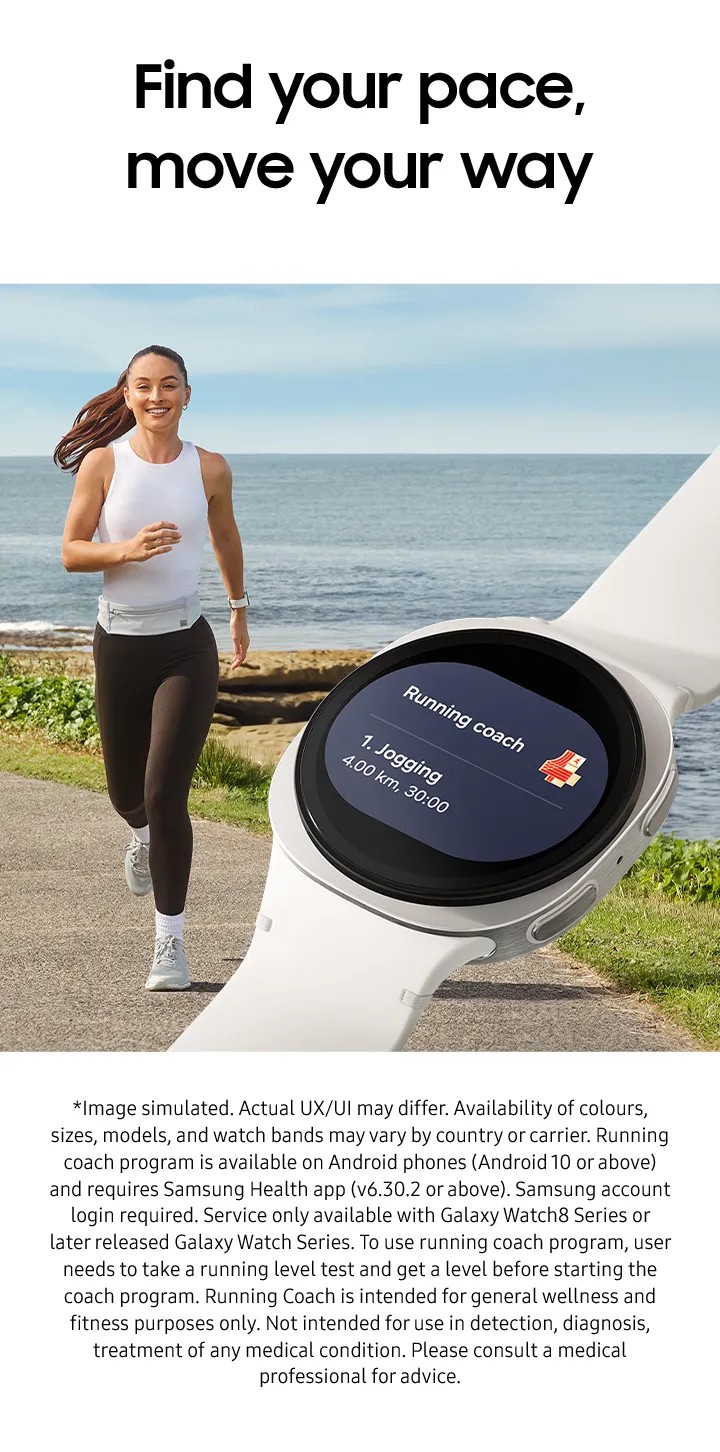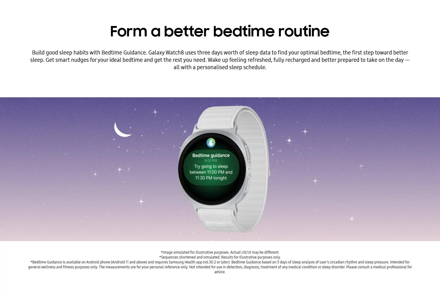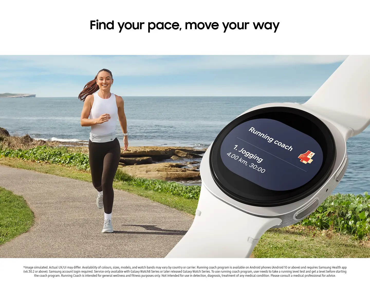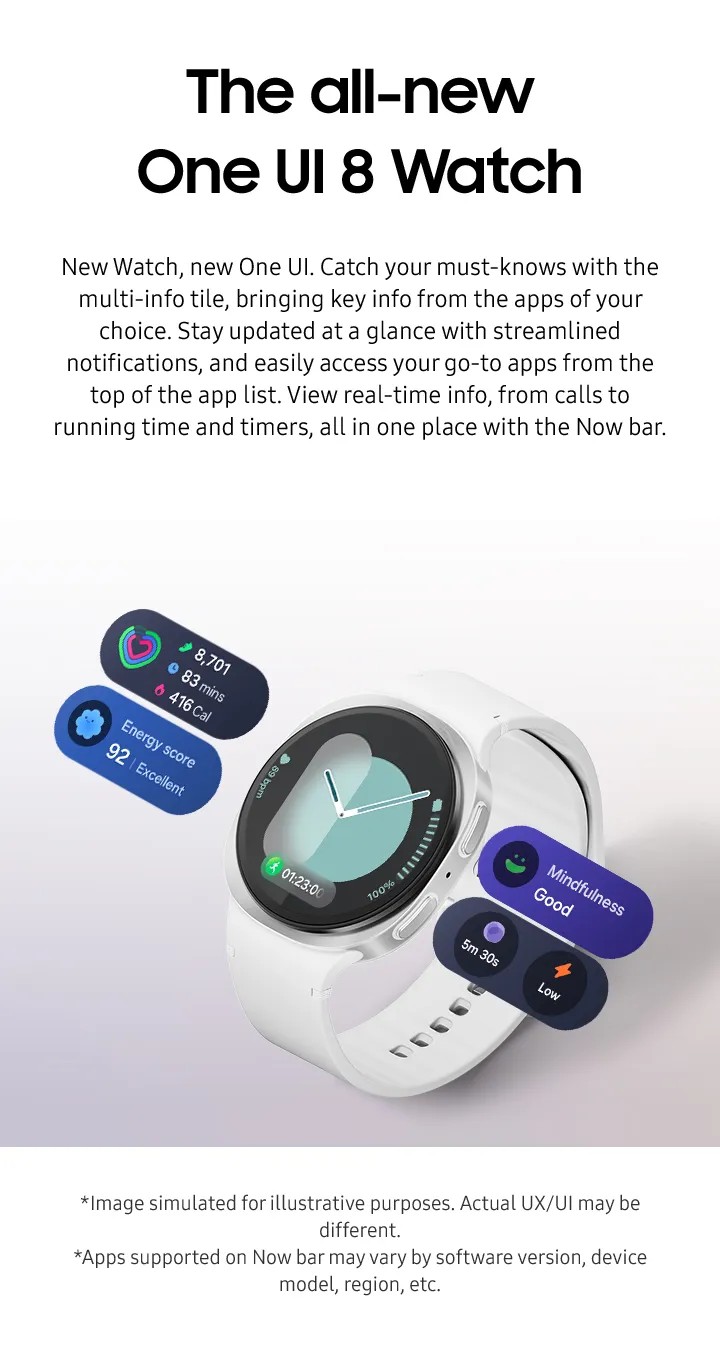 Take control of your wellness with the latest in AI-powered tracking and insights. From smarter workout analysis to intelligent sleep tracking and in-depth insights, you’ll get personalised suggestions, actionable Wellness Tips, and a daily Energy Score – all designed to turn your data into real, everyday impact. It's not just tracking – it’s your wellness story, redefined. Featuring Samsung’s thinnest design ever, enhanced comfort, and a vibrant sapphire crystal display, the Galaxy Watch8 is built to move with you, day and night.