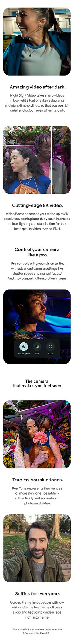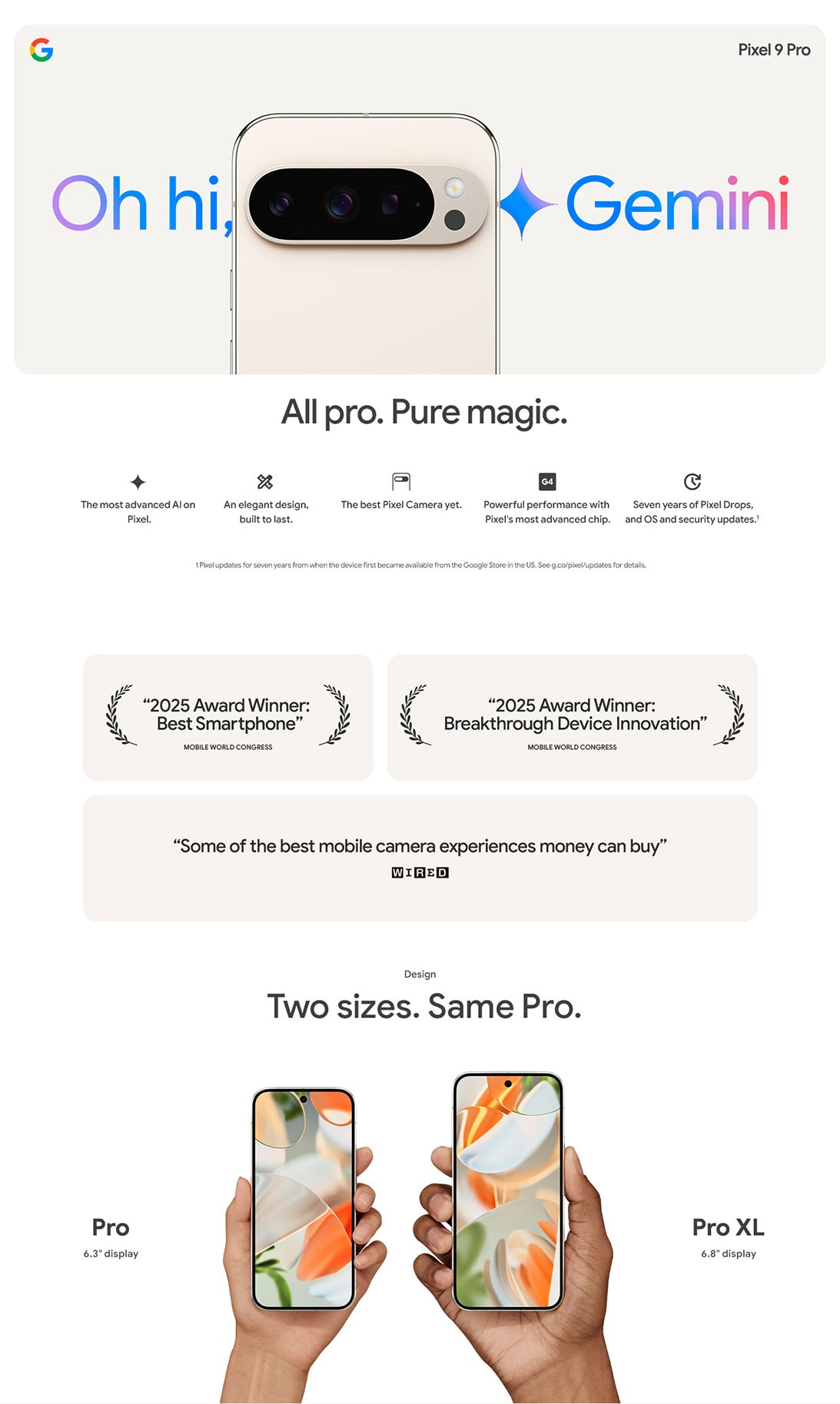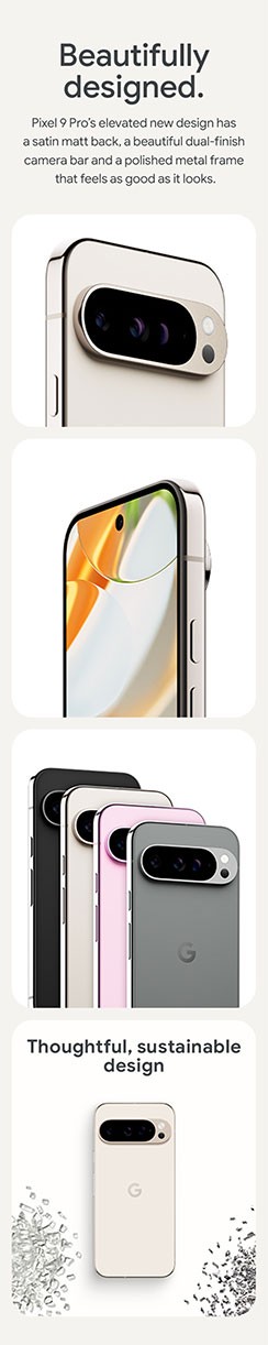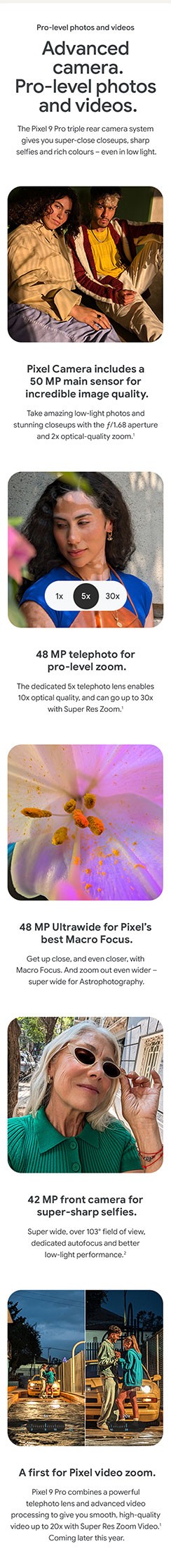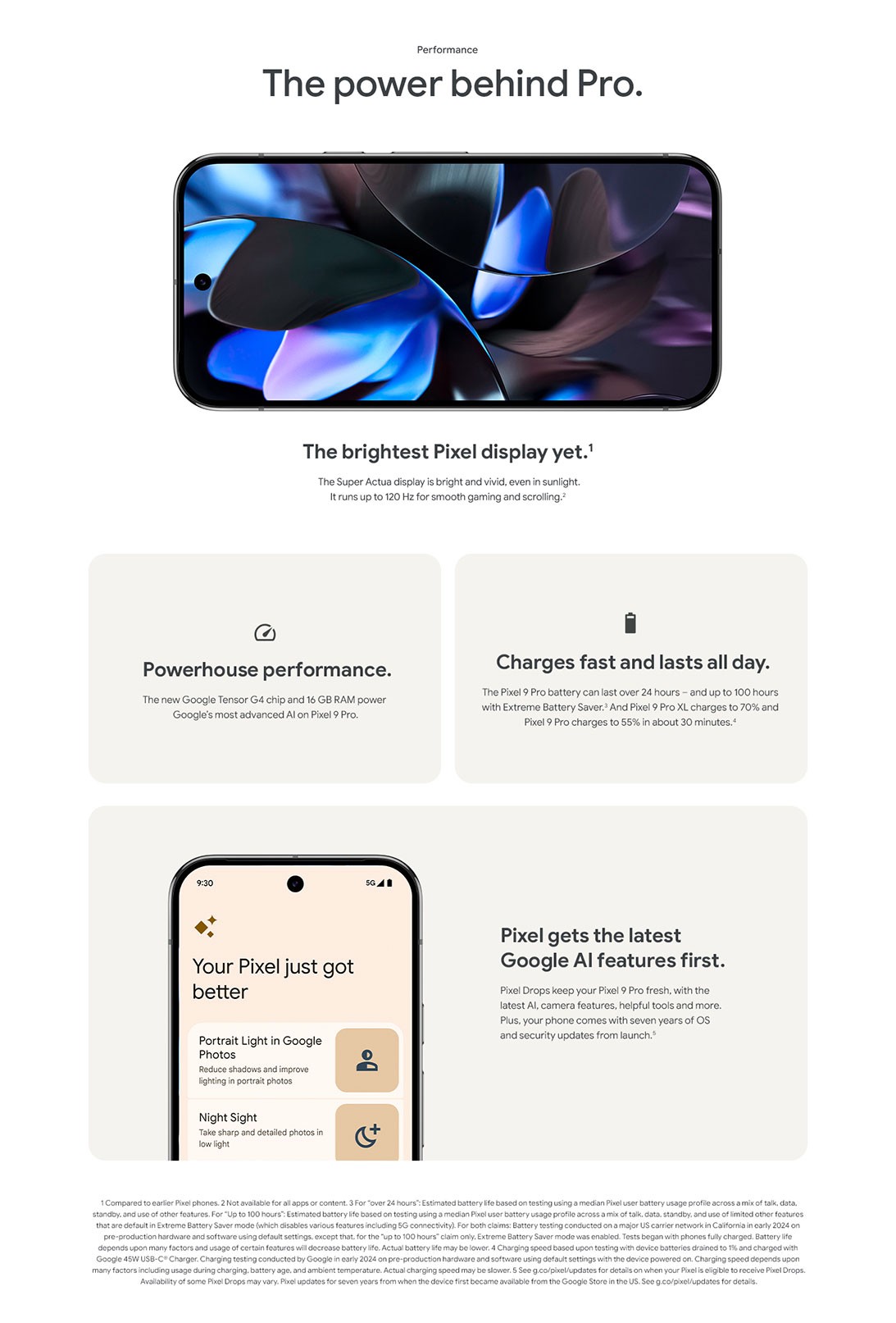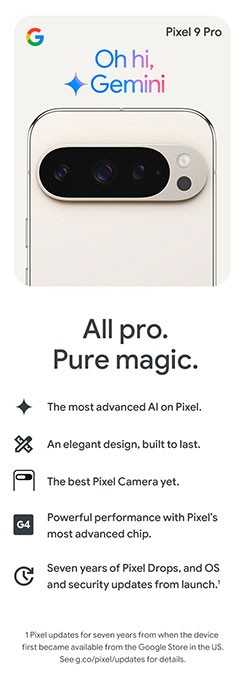 The Google Pixel 9 Pro. All Pro. Pure magic. It’s faster, more efficient and more secure than ever, thanks to the powerful Google Tensor G4 chip. It delivers pro-level photos and video. The triple rear camera is the most powerful Pixel Camera ever. It’s built to last and be super dependable with an all-day battery and a fast charge, so you won’t have to wait. Pixel is now your go to AI assistant with Gemini.