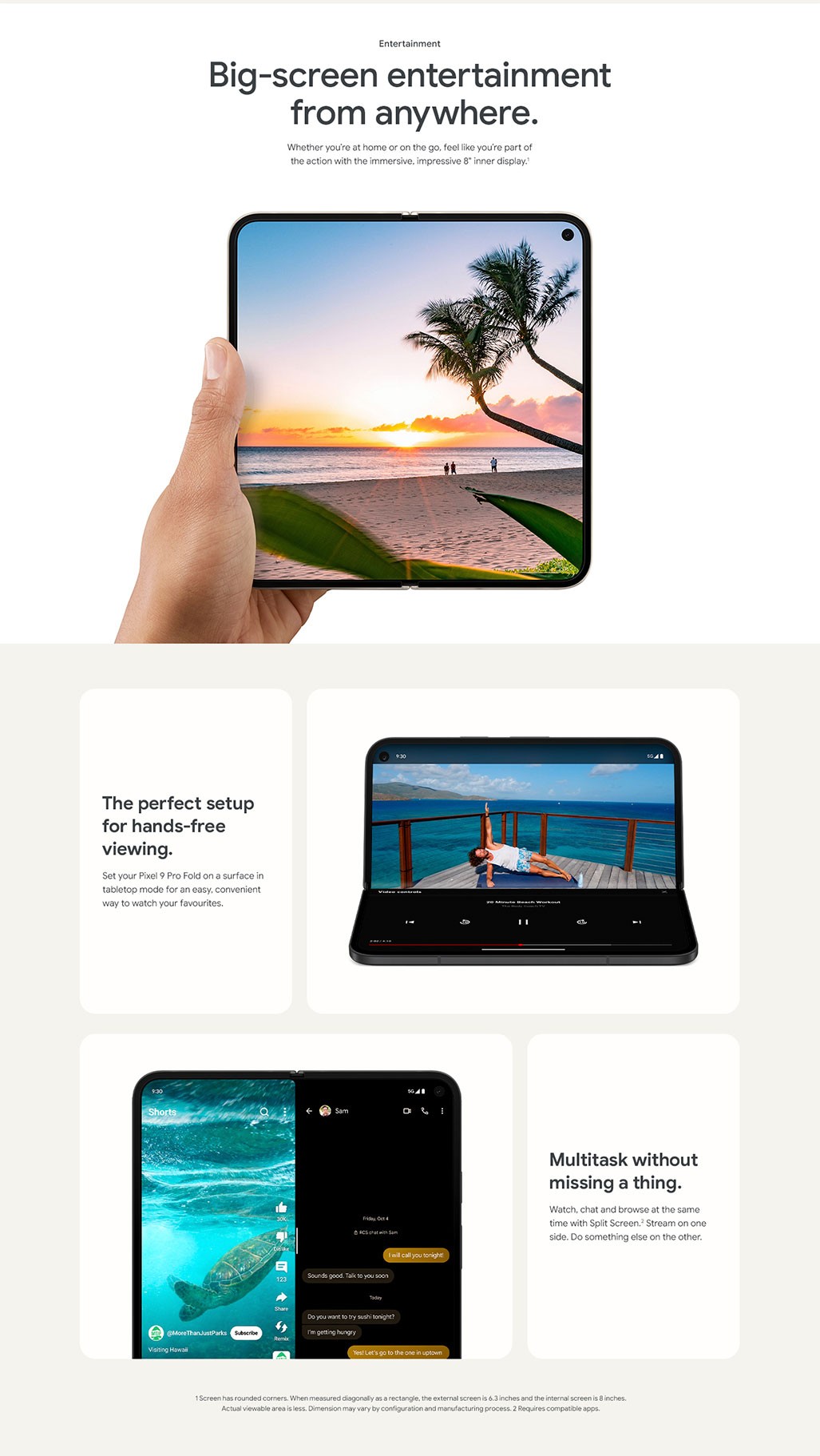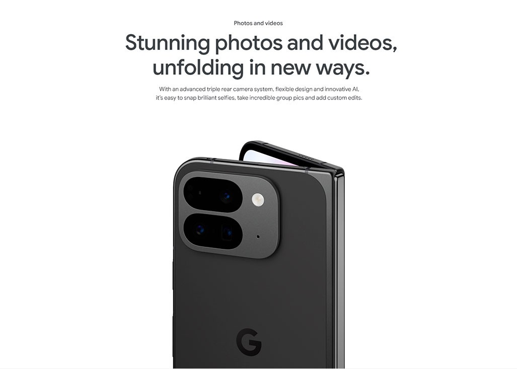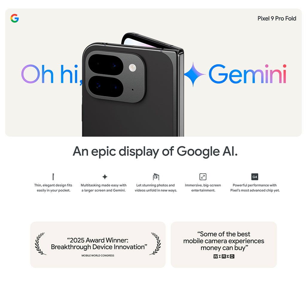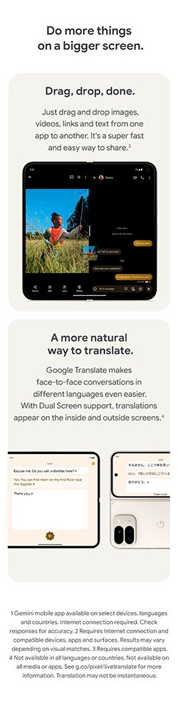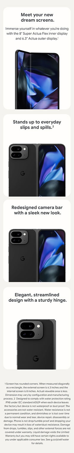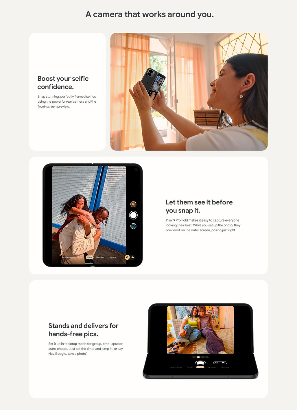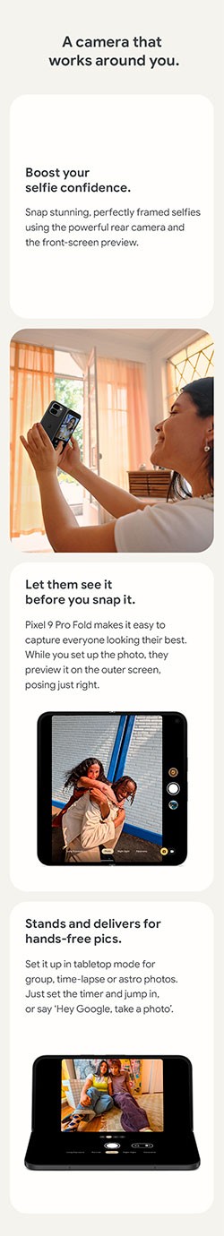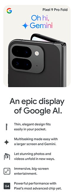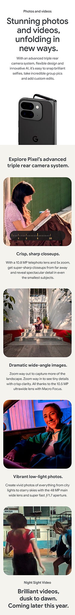 Meet Pixel 9 Pro Fold with Gemini. It's engineered by Google and brings you the best of Google’s AI first. With a display of epic proportions, you can multitask in Split Screen and enjoy immersive entertainment. 1Snap brilliant selfies with the powerful rear camera and use tabletop mode for hands-free pics.