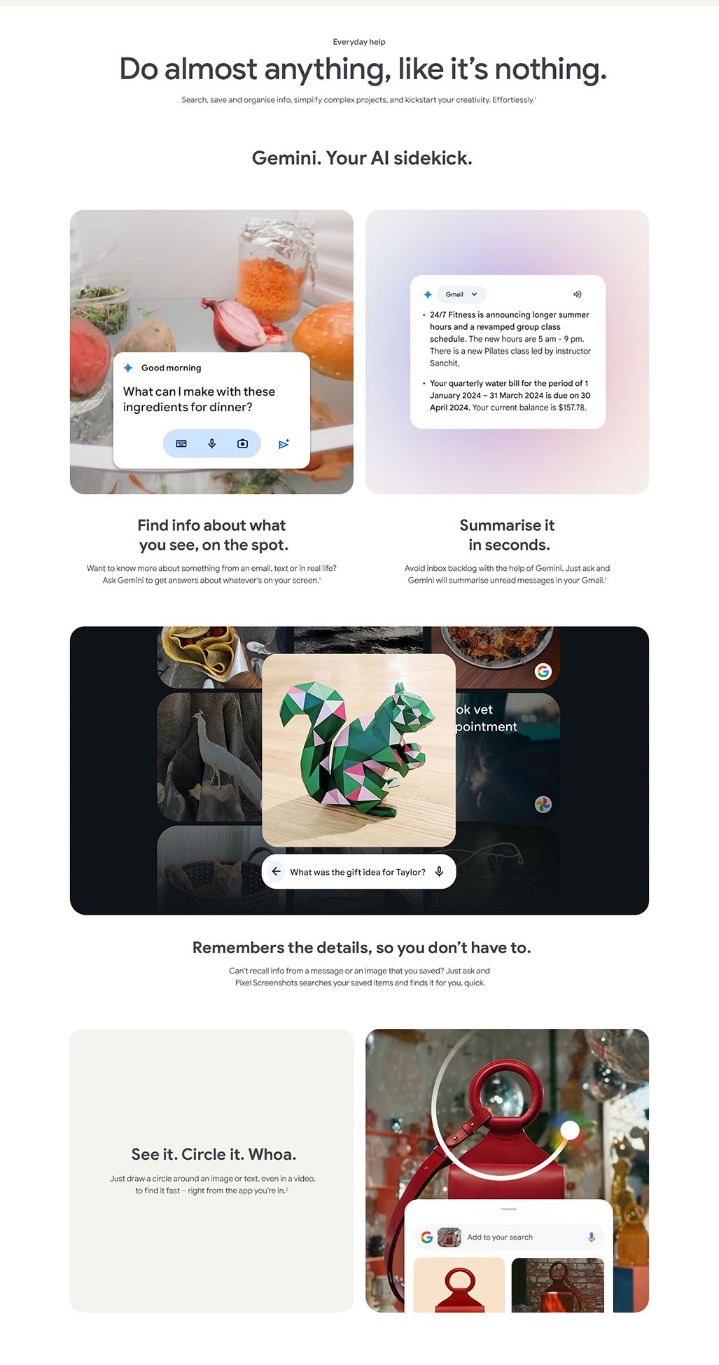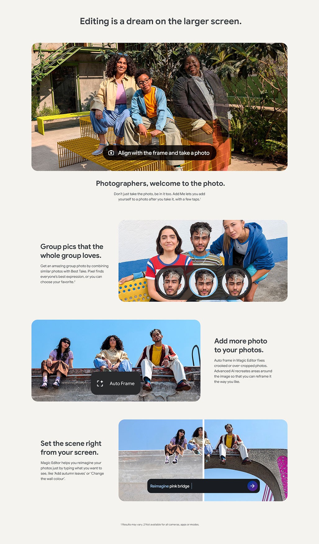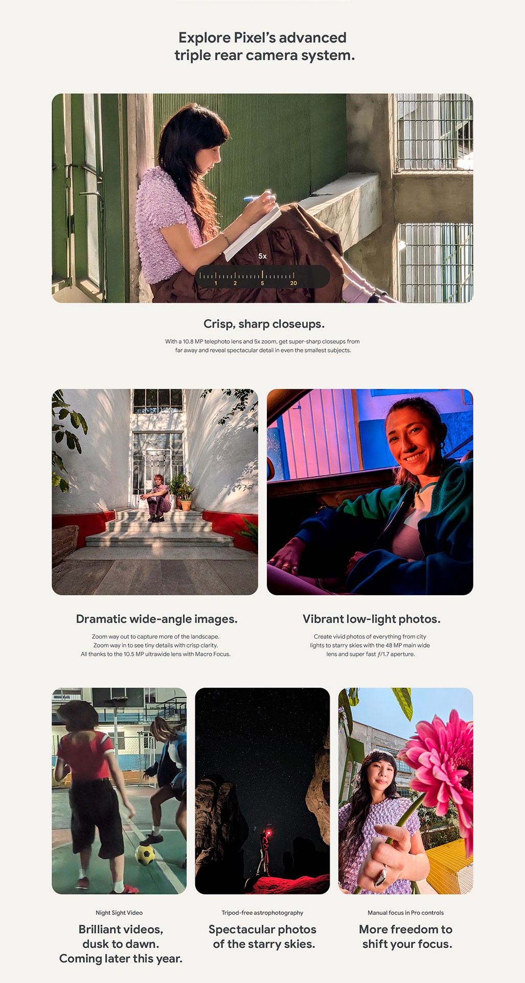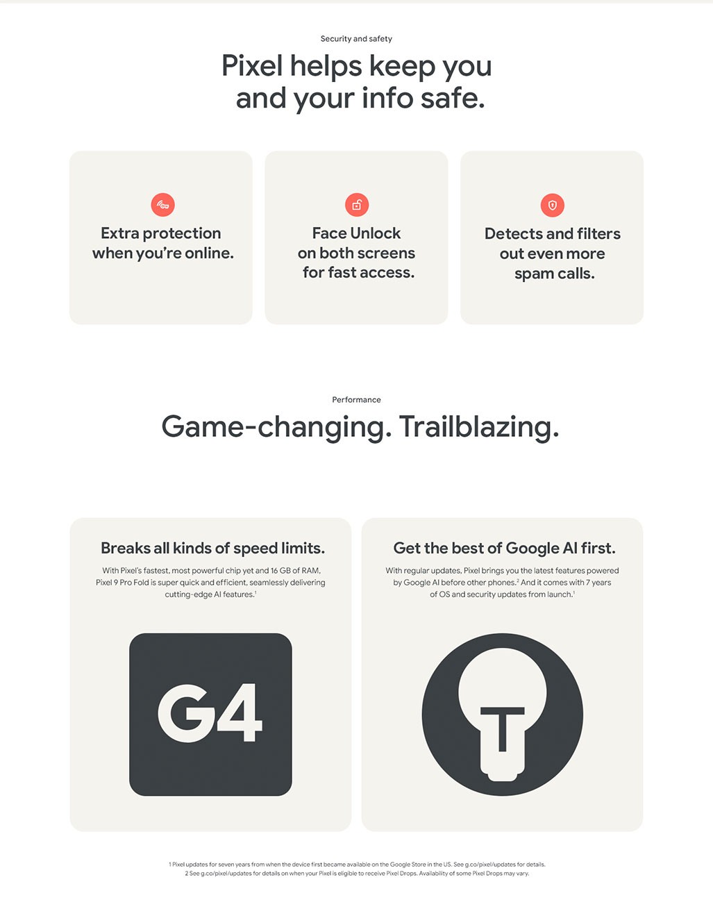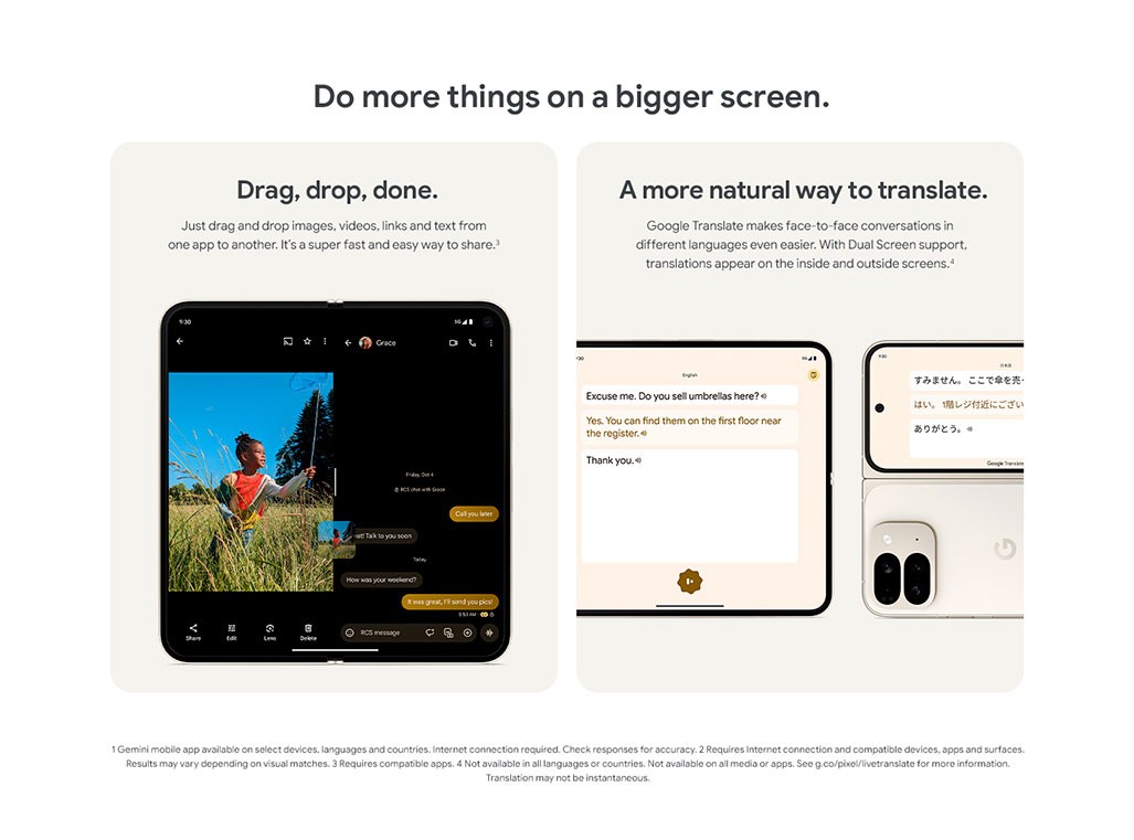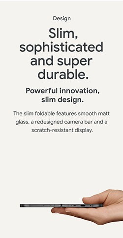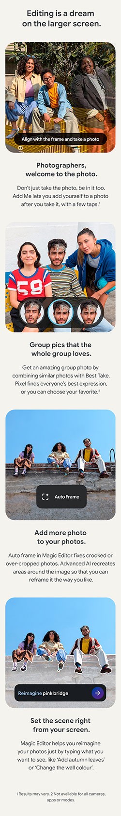 Meet Pixel 9 Pro Fold with Gemini. It's engineered by Google and brings you the best of Google’s AI first. With a display of epic proportions, you can multitask in Split Screen and enjoy immersive entertainment. 1Snap brilliant selfies with the powerful rear camera and use tabletop mode for hands-free pics.