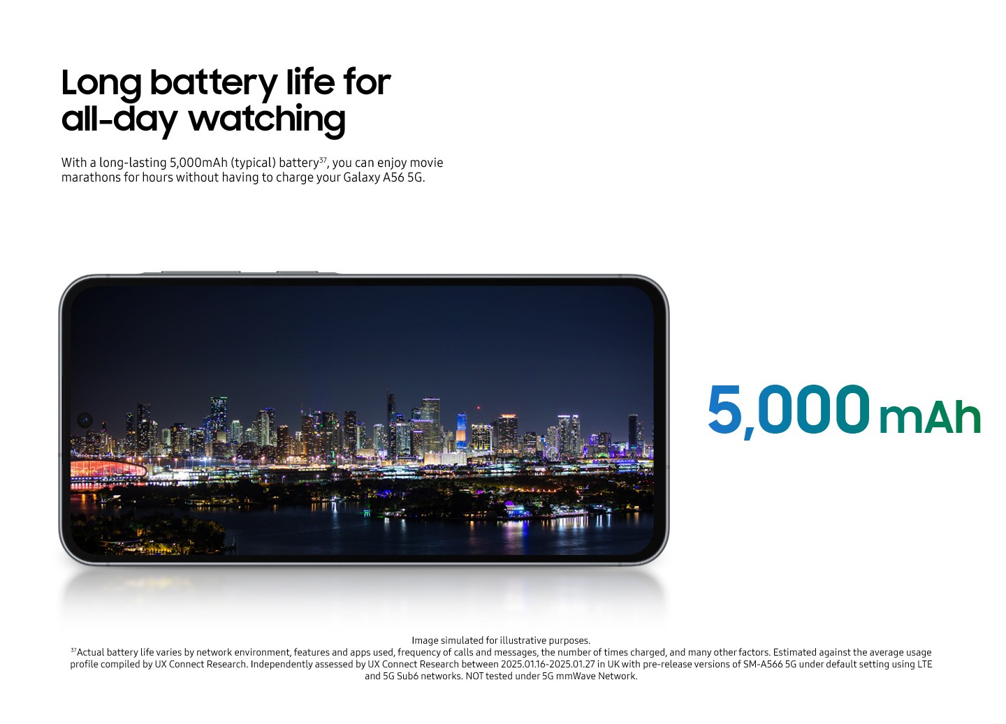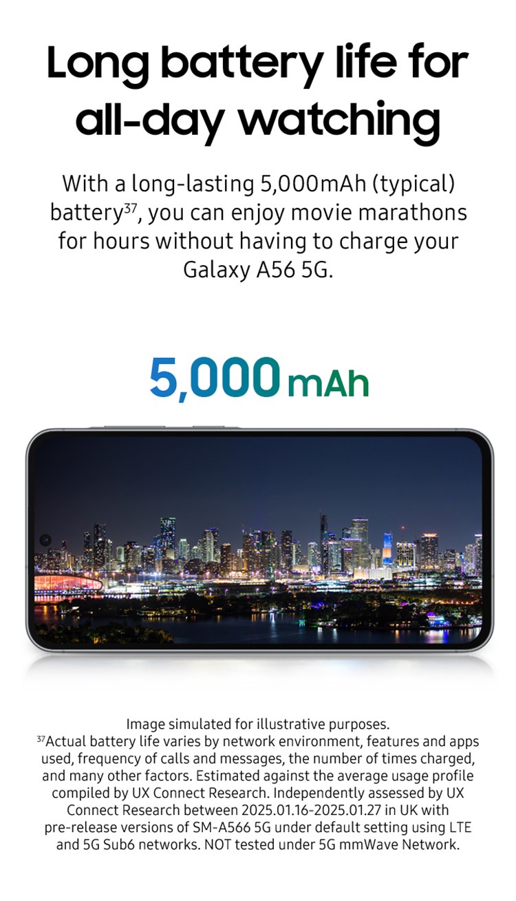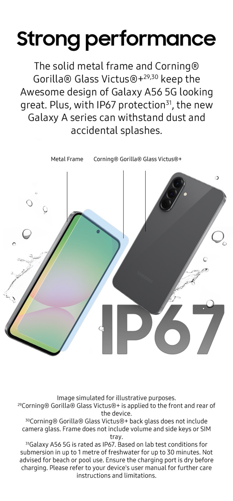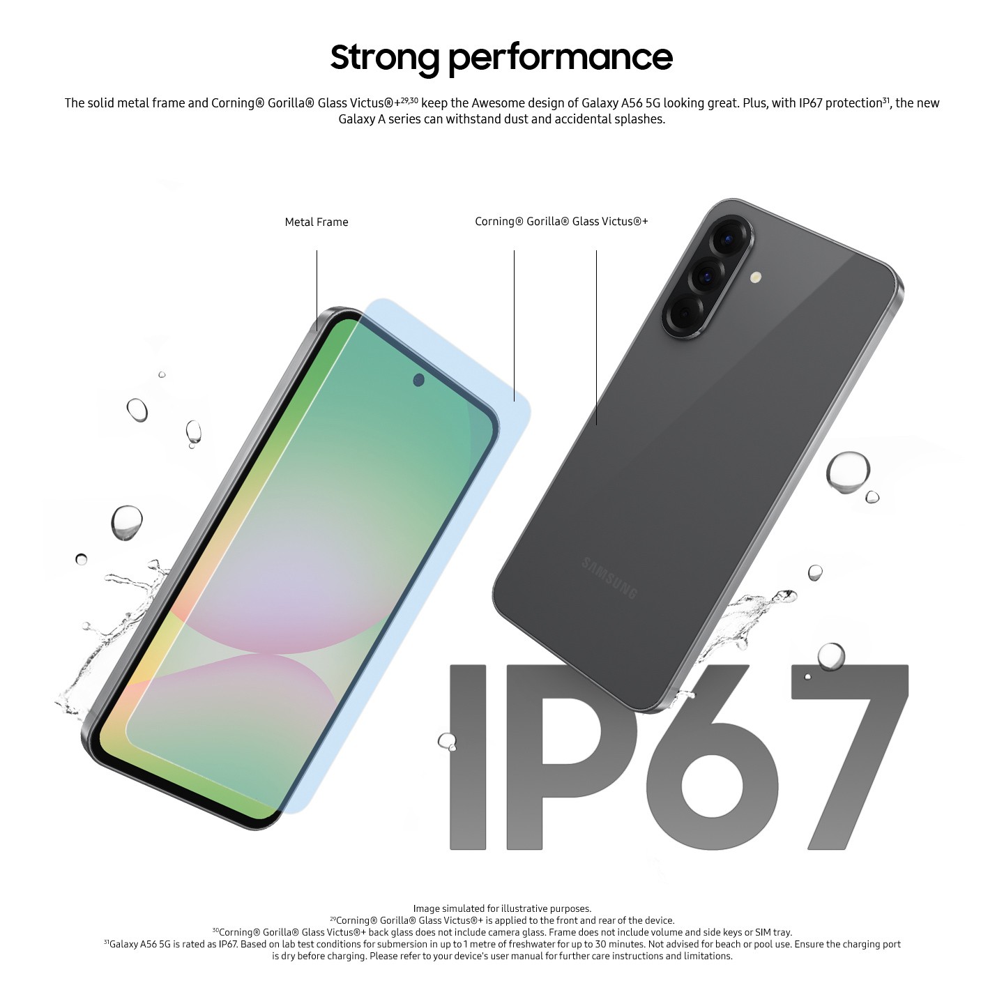 Blending awesome performance, display and design, the Samsung Galaxy A56 5G is all style. From awesome adventures to everyday life, now you can capture exceptional photos with the upgraded 50MP camera or record breathtaking videos in Super HDR. Get the info you want, quickly, thanks to Circle to Search – simply circle, highlight or tap an object or text onscreen to get instant Google Search results. Multitask more seamlessly than ever with the powerful Octa-core processor, boosted cooling system and 128GB of storage. Experience it all on the immersive 6.7" FHD+ Super AMOLED display, powered by a longlasting 5,000mAh battery so you can enjoy your favourite entertainment for longer. Plus, have peace of mind knowing your Galaxy A56 is built to withstand life’s wear and tear, with a solid metal frame and IP67-grade dust and splash resistance.