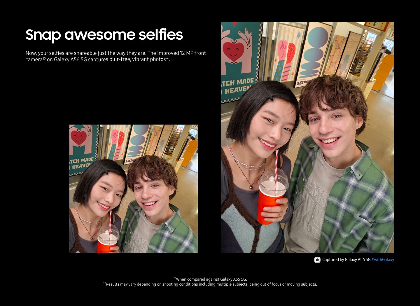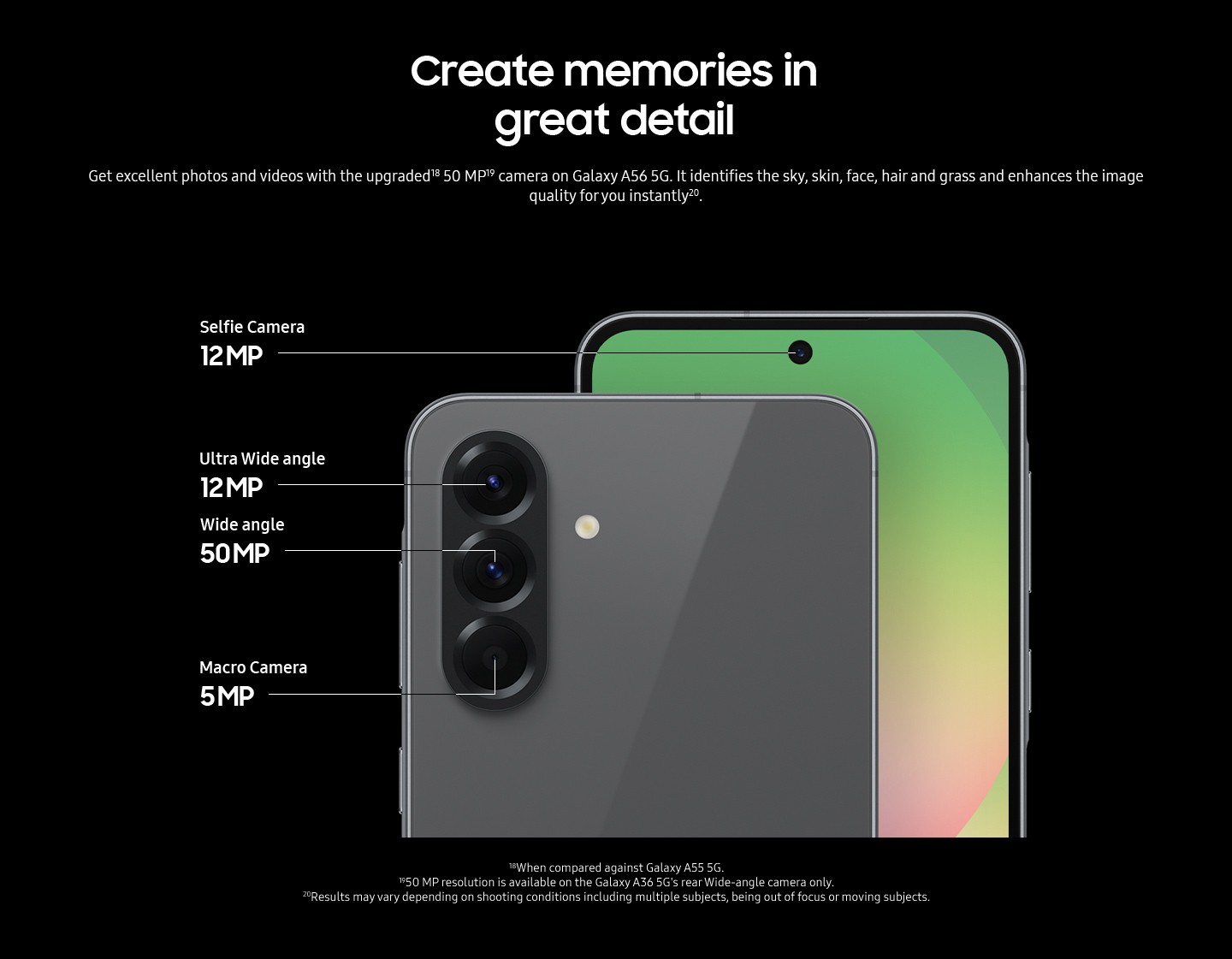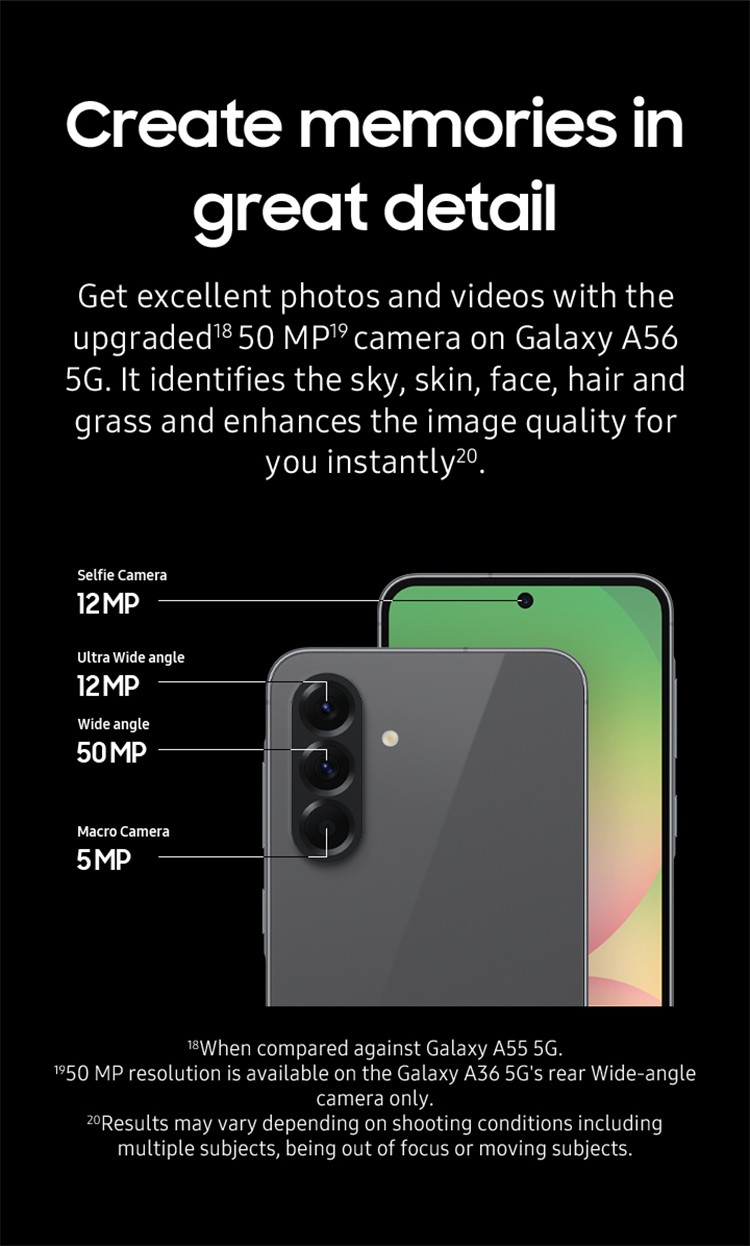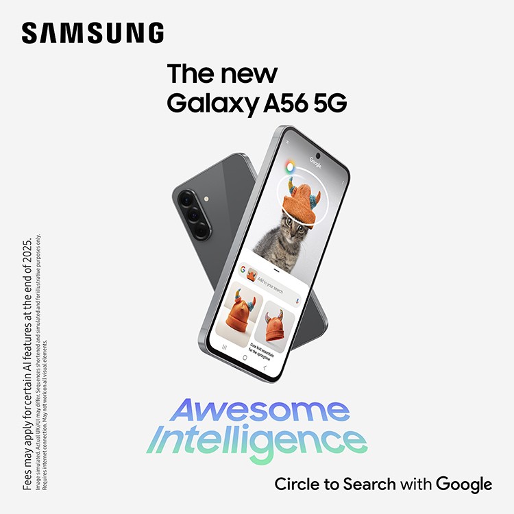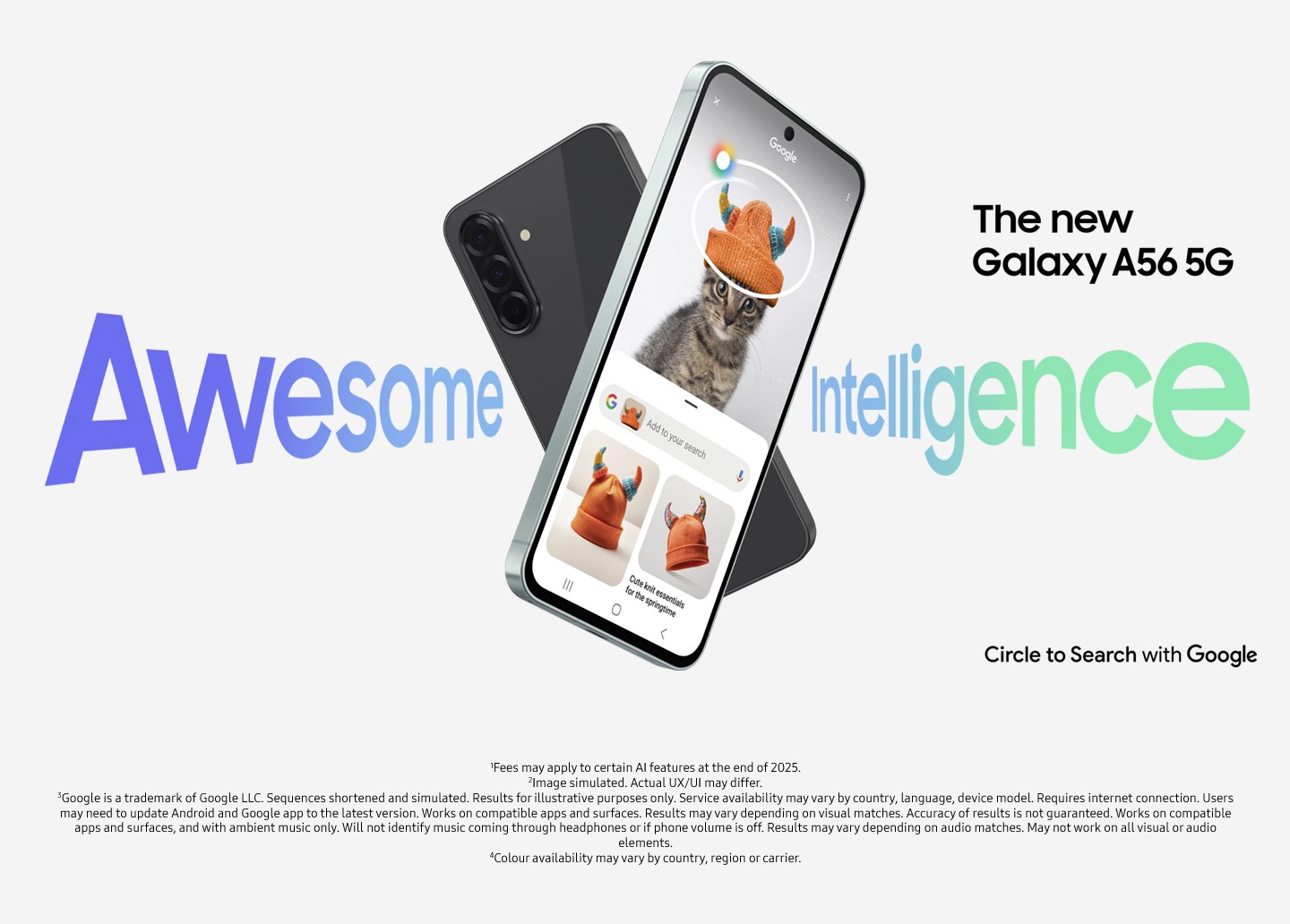 Blending awesome performance, display and design, the Samsung Galaxy A56 5G is all style. From awesome adventures to everyday life, now you can capture exceptional photos with the upgraded 50MP camera or record breathtaking videos in Super HDR. Get the info you want, quickly, thanks to Circle to Search – simply circle, highlight or tap an object or text onscreen to get instant Google Search results. Multitask more seamlessly than ever with the powerful Octa-core processor, boosted cooling system and 128GB of storage. Experience it all on the immersive 6.7" FHD+ Super AMOLED display, powered by a longlasting 5,000mAh battery so you can enjoy your favourite entertainment for longer. Plus, have peace of mind knowing your Galaxy A56 is built to withstand life’s wear and tear, with a solid metal frame and IP67-grade dust and splash resistance.