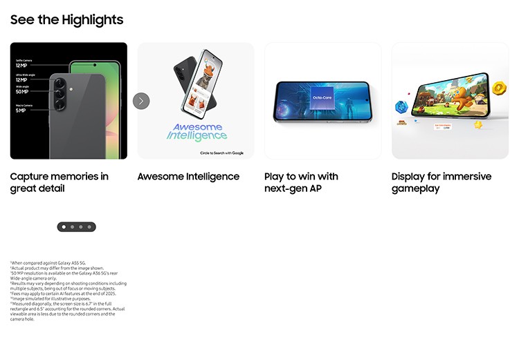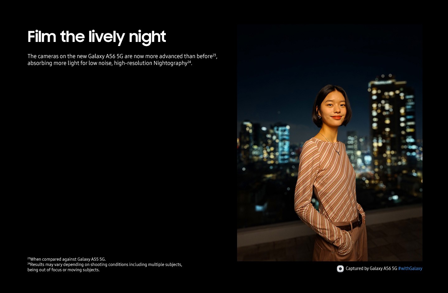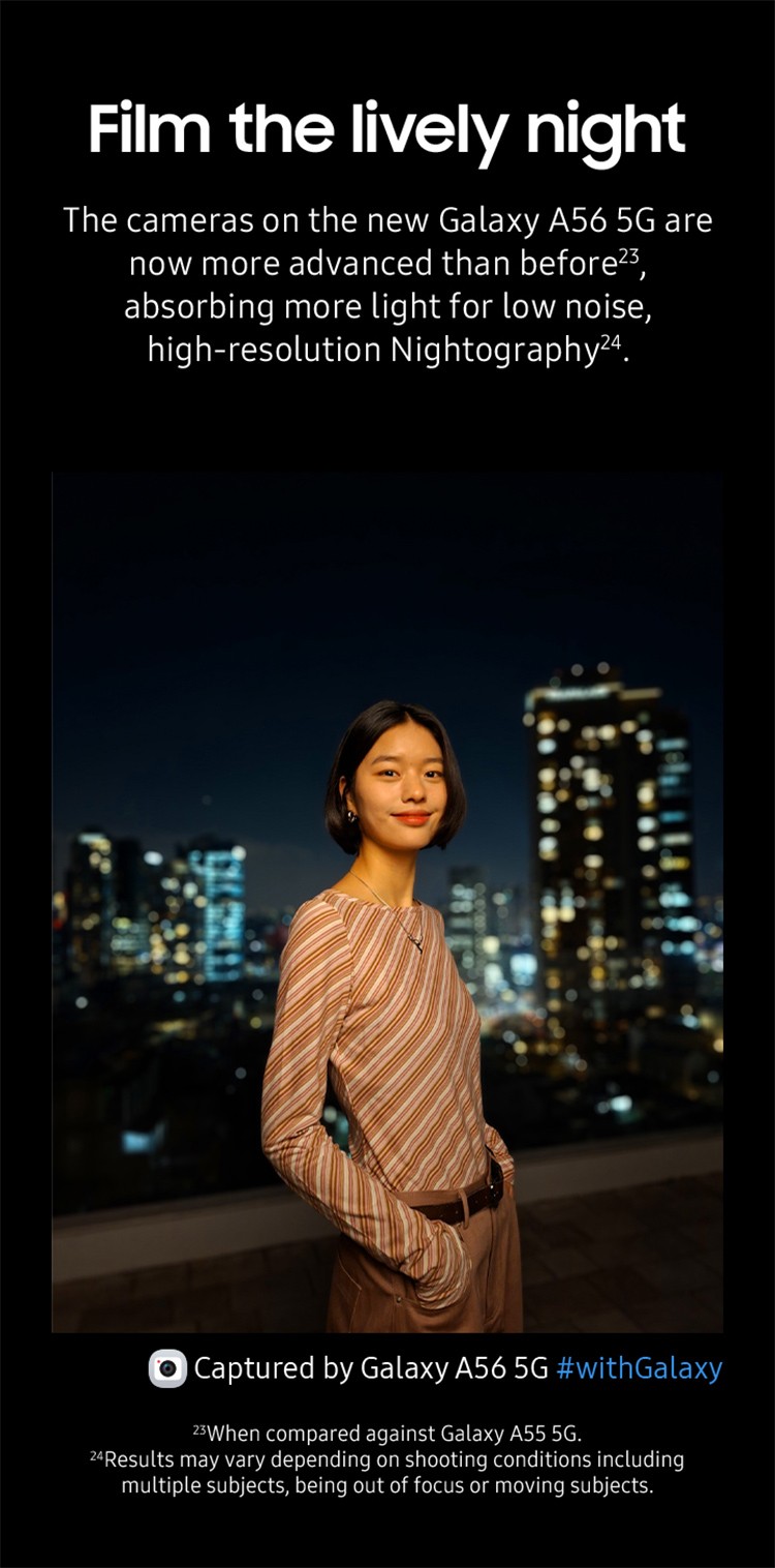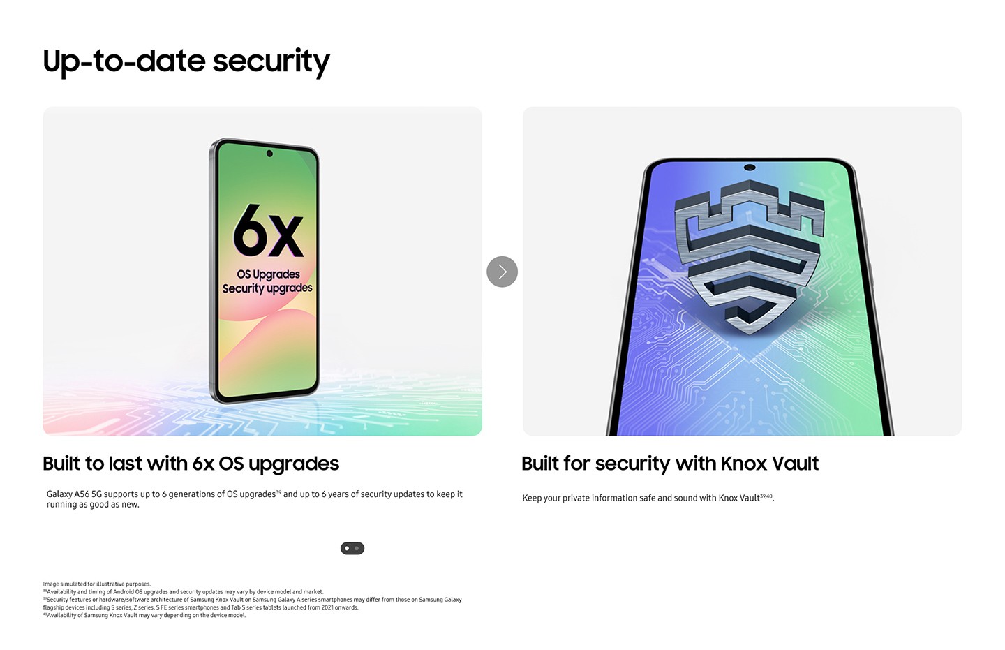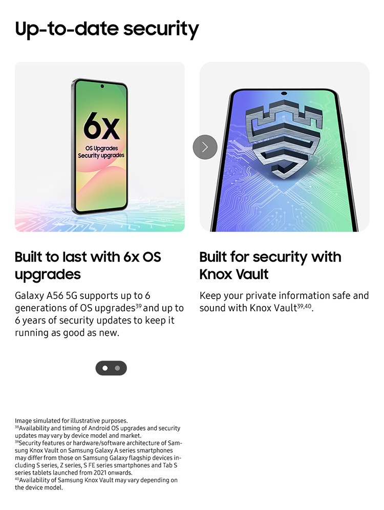 Blending awesome performance, display and design, the Samsung Galaxy A56 5G is all style. From awesome adventures to everyday life, now you can capture exceptional photos with the upgraded 50MP camera or record breathtaking videos in Super HDR. Get the info you want, quickly, thanks to Circle to Search – simply circle, highlight or tap an object or text onscreen to get instant Google Search results. Multitask more seamlessly than ever with the powerful Octa-core processor, boosted cooling system and 128GB of storage. Experience it all on the immersive 6.7" FHD+ Super AMOLED display, powered by a longlasting 5,000mAh battery so you can enjoy your favourite entertainment for longer. Plus, have peace of mind knowing your Galaxy A56 is built to withstand life’s wear and tear, with a solid metal frame and IP67-grade dust and splash resistance.