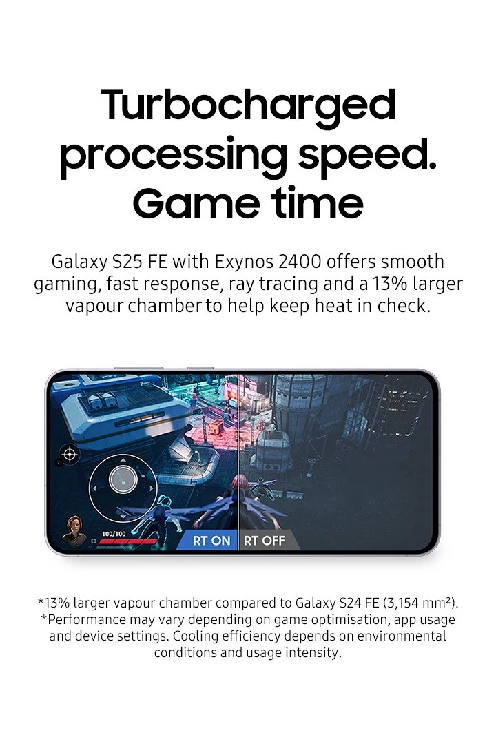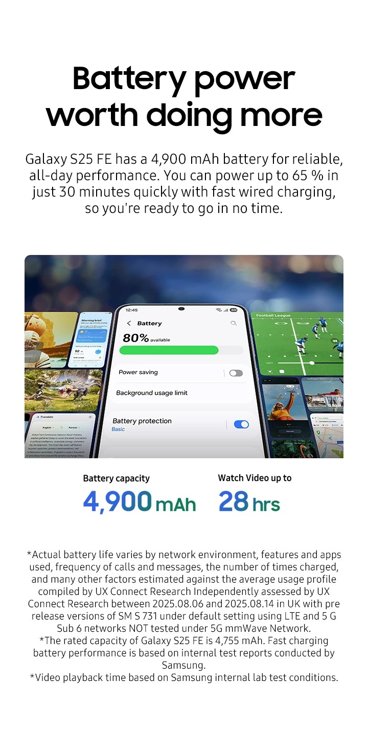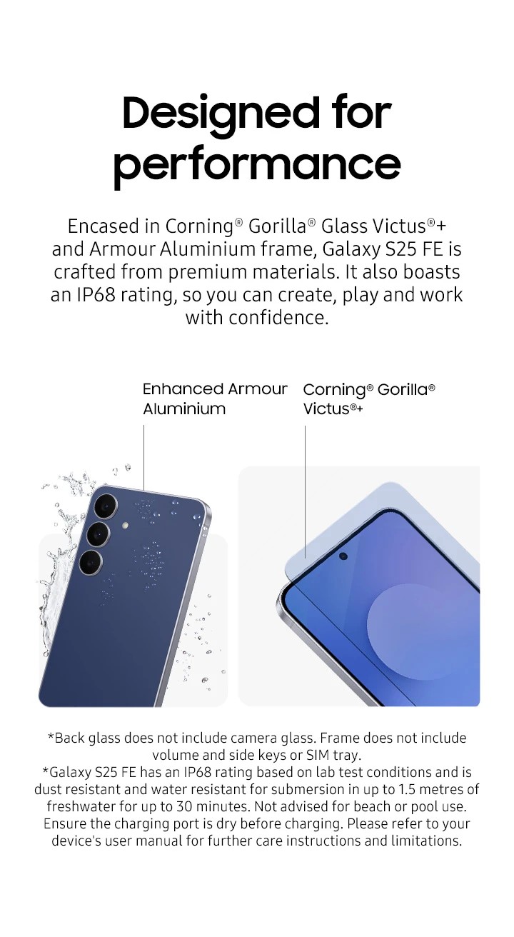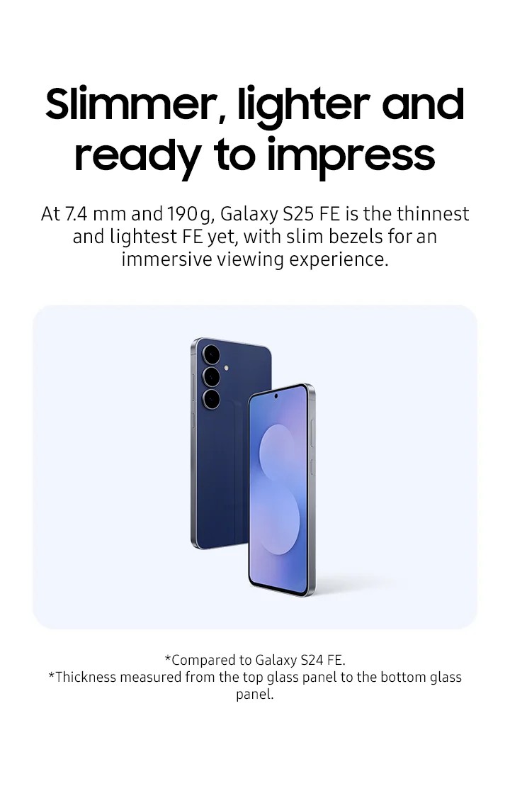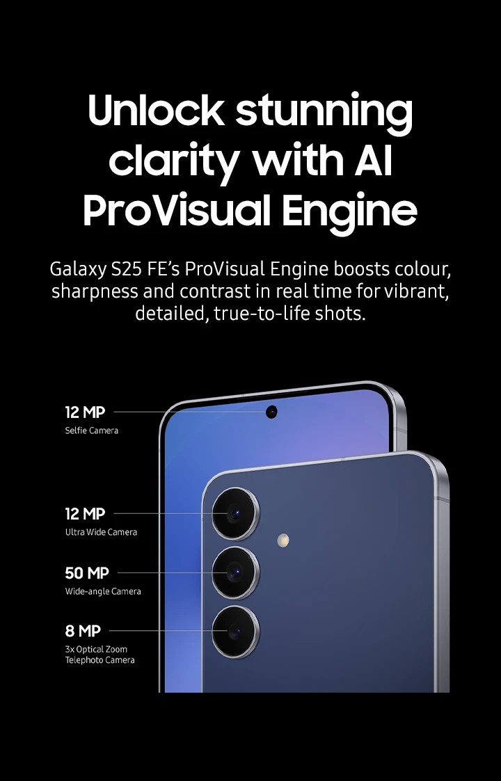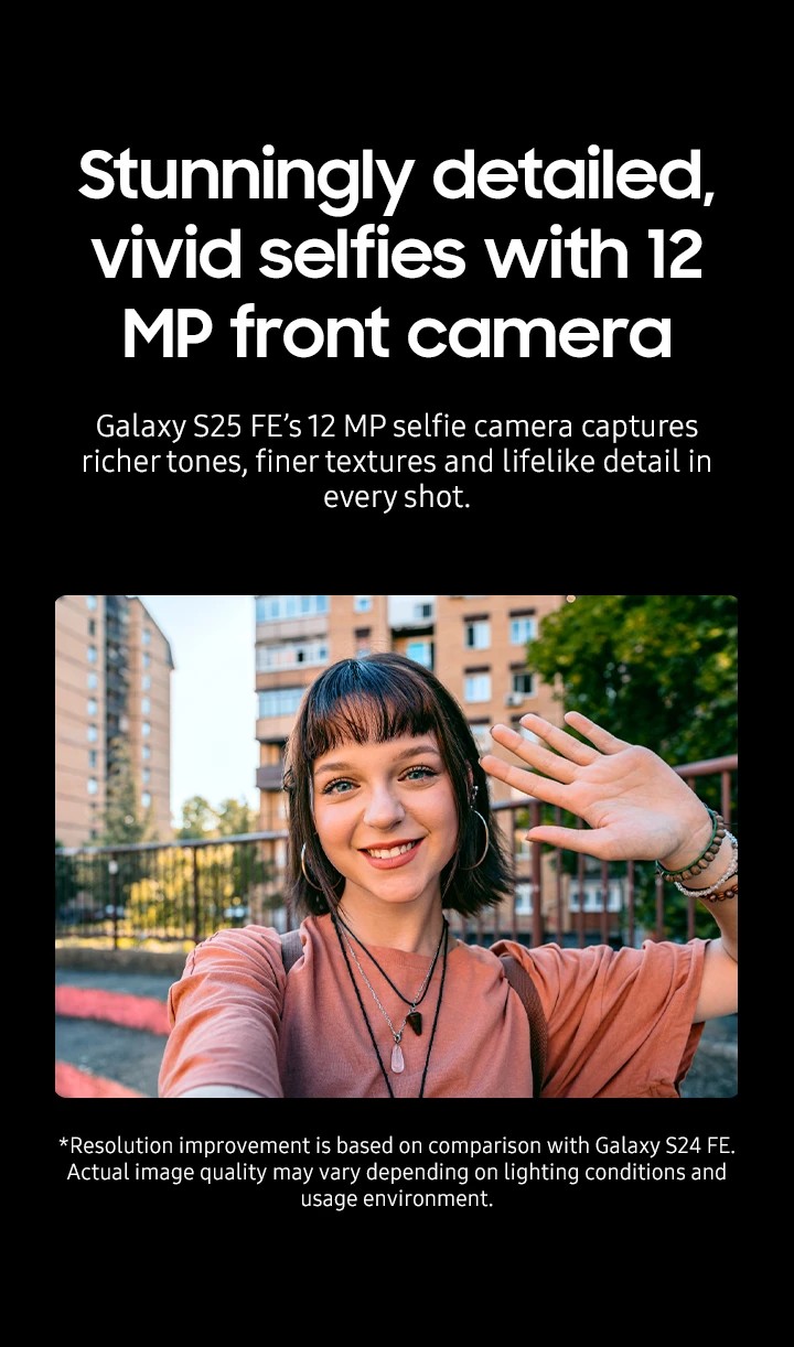 Capture captivating memories with the new Galaxy S25 FE, featuring a high-performance 50MP main camera and Galaxy’s most advanced AI Pro-Visual Engine, plus a 12MP front sensor and triple camera setup for vibrant photos and elevated selfies. Stay powered throughout your day with a long-lasting 4900mAh battery and 45W Super-Fast Charging 2.0 (charger sold separately) for quick top-ups. Enjoy flagship-level design at an accessible price, with a sleek interface, thinner display bezels, and a high-performance 6.7” display for ultra-smooth scrolling. Built tough with Gorilla Glass Victus+ front and back and an IP68 rating, the slim yet durable design lets you create, play, and work anywhere with confidence. Powered by Galaxy AI, the S25 FE becomes your ultimate companion, speak naturally with Gemini Live to get real-time information and share your moments through the camera to ask for advice or spark new ideas.
