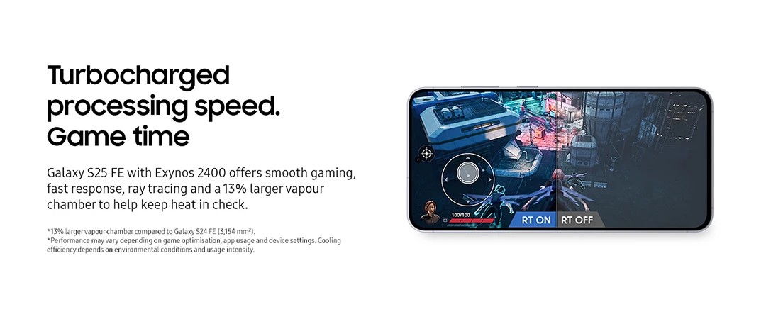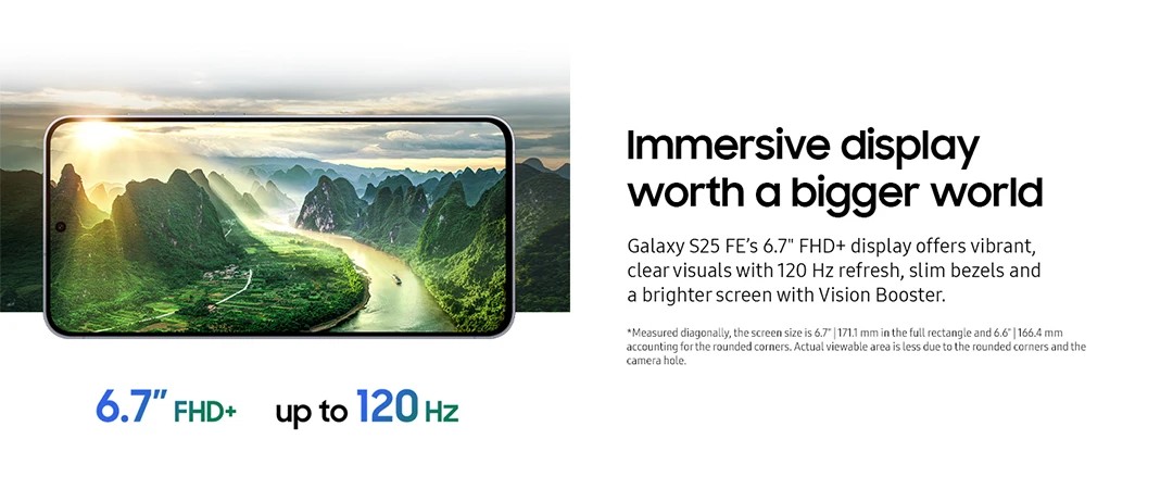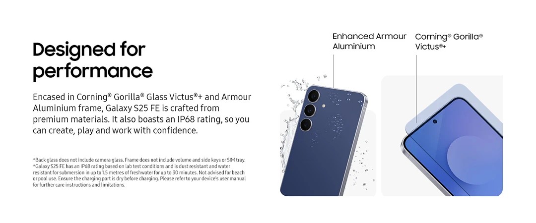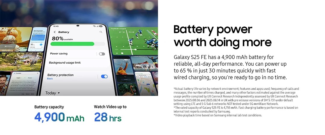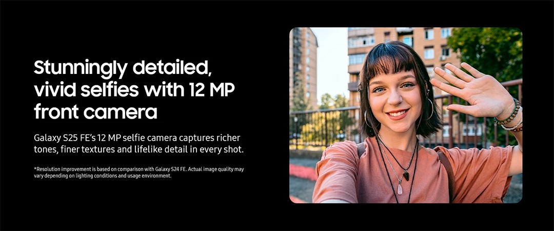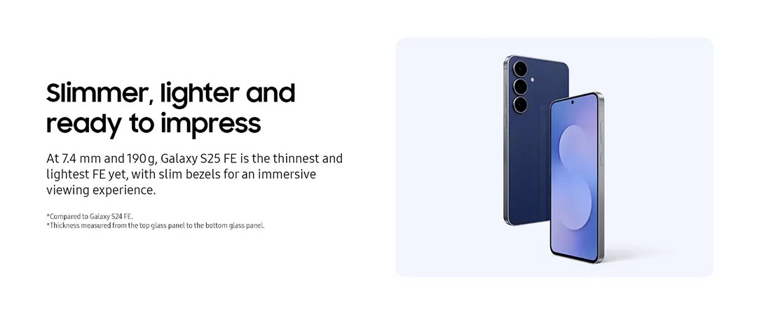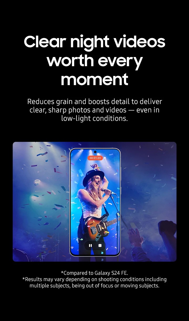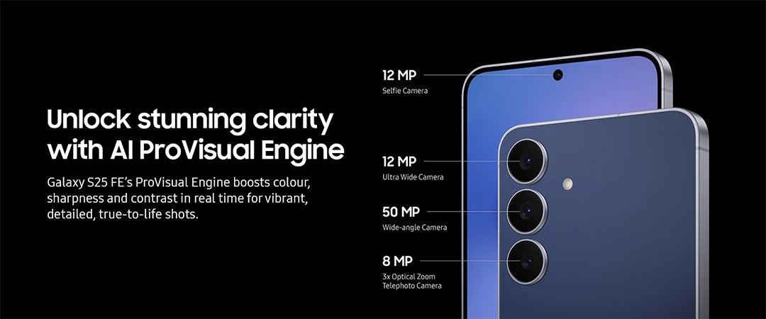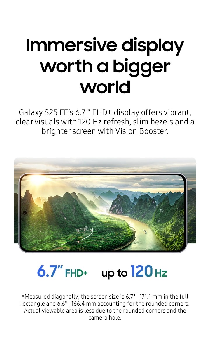 Capture captivating memories with the new Galaxy S25 FE, featuring a high-performance 50MP main camera and Galaxy’s most advanced AI Pro-Visual Engine, plus a 12MP front sensor and triple camera setup for vibrant photos and elevated selfies. Stay powered throughout your day with a long-lasting 4900mAh battery and 45W Super-Fast Charging 2.0 (charger sold separately) for quick top-ups. Enjoy flagship-level design at an accessible price, with a sleek interface, thinner display bezels, and a high-performance 6.7” display for ultra-smooth scrolling. Built tough with Gorilla Glass Victus+ front and back and an IP68 rating, the slim yet durable design lets you create, play, and work anywhere with confidence. Powered by Galaxy AI, the S25 FE becomes your ultimate companion, speak naturally with Gemini Live to get real-time information and share your moments through the camera to ask for advice or spark new ideas.