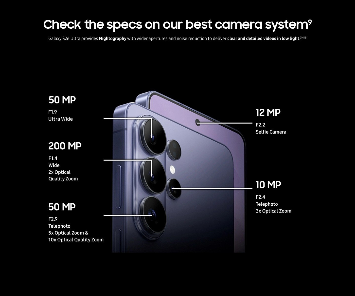 - 200MP (Wide, f/1.4), 10MP (Telephoto, f/2.4) 3x, 50MP (Telephoto, f/2.9) 5x, 50MP (Ultra-Wide f/1.9)