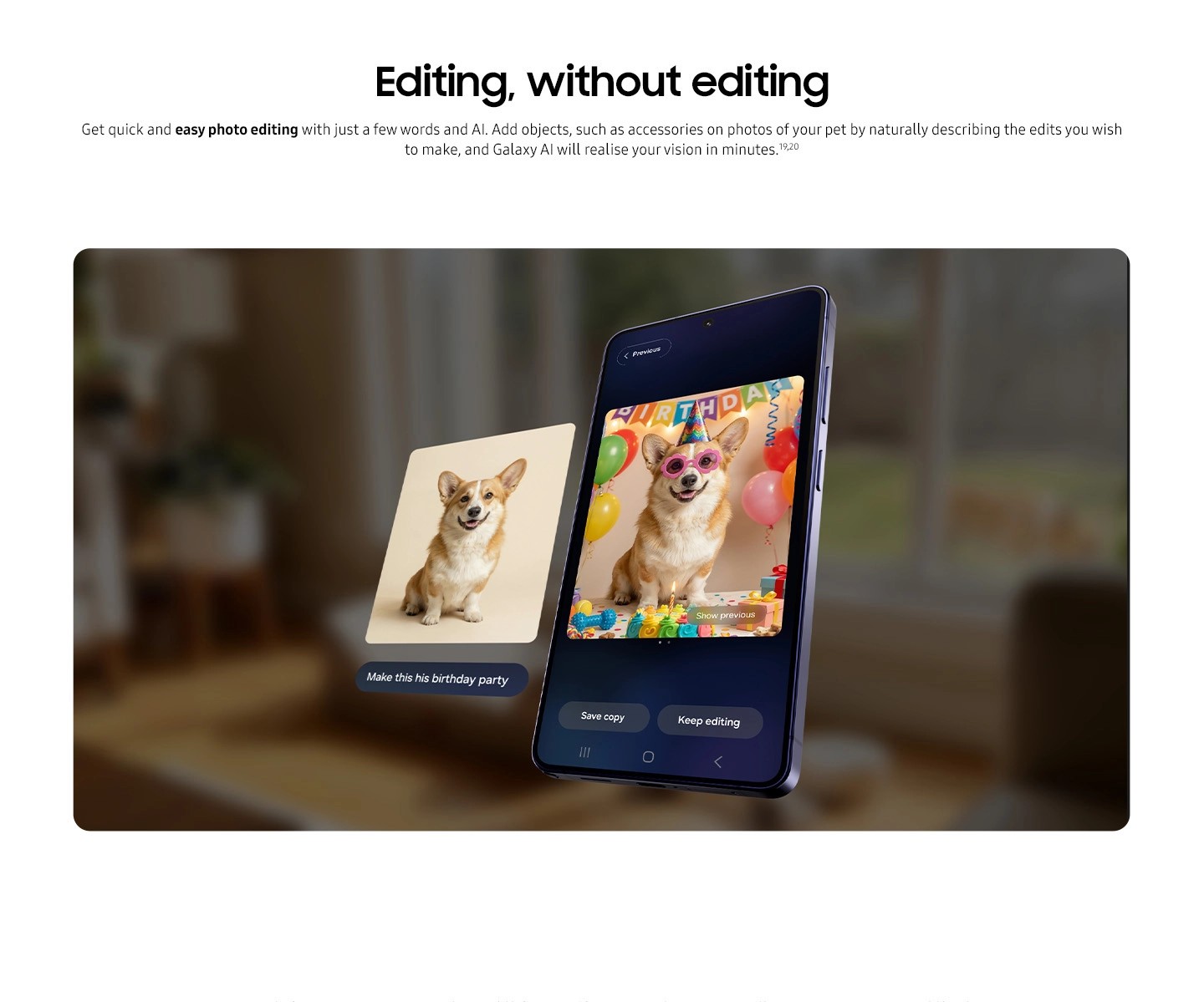 19Generative Edit feature for Photo Assist requires a network connection and Samsung Account login. Editing with Generative Edit may result in a resized photo. A visible watermark is overlaid on the image output upon saving in order to indicate that the image is generated by AI. The accuracy and reliability of the generated output is not guaranteed. Contains AI-generated images with edits.