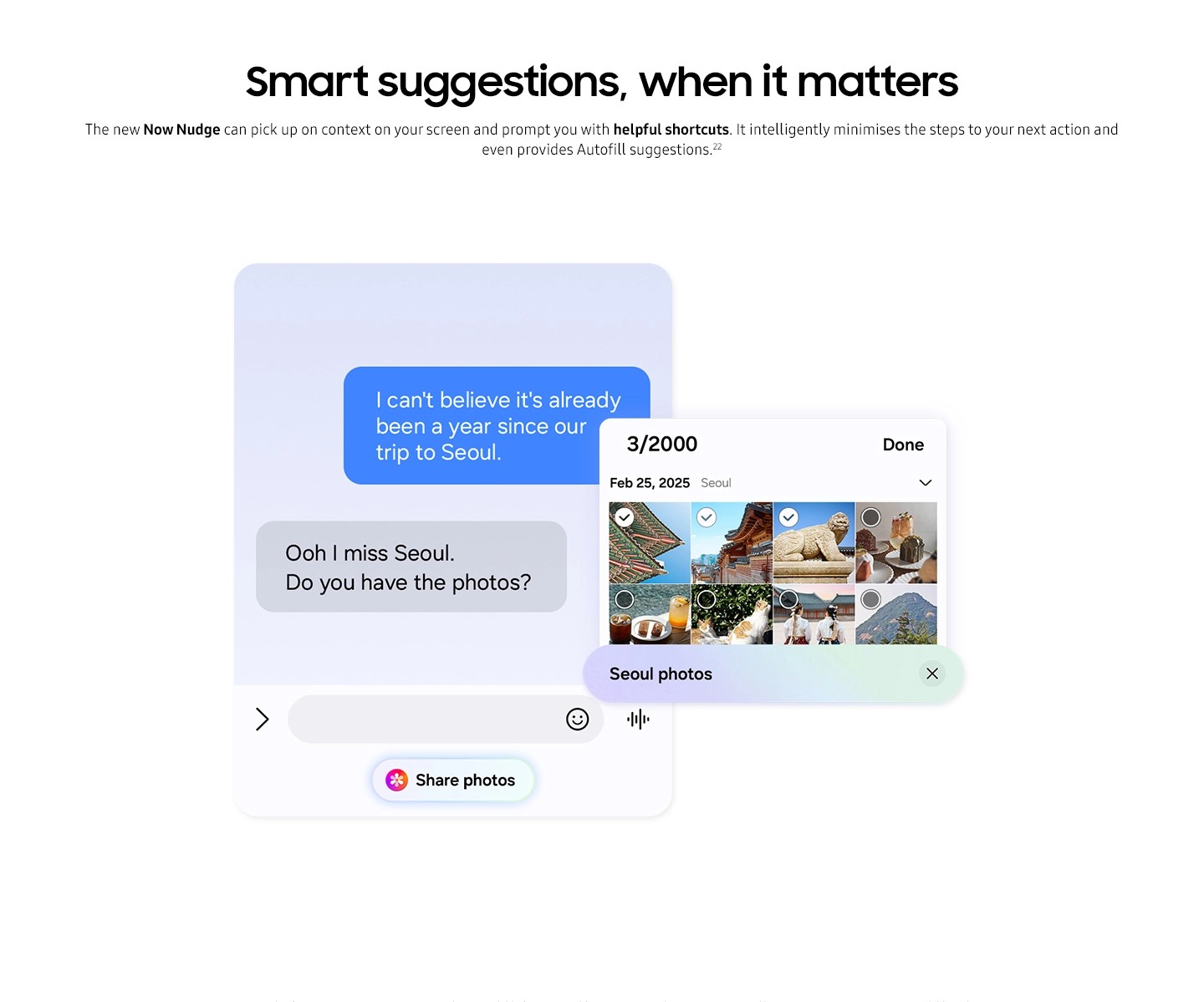 22Now Nudge feature requires a Samsung Account login. Available functions and features may vary by country, region and language. Text message prompts available with certain third party messaging apps including Samsung Messages, Google Messages, Google Chat, WhatsApp, WhatsApp Business, KakaoTalk, LINE, Signal, Instagram (DM), Tango, NTT Docomo Messages, KDDI Messages. Share photos in Now Nudge works by analysing available image content. Accuracy of results is not guaranteed.