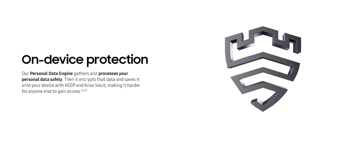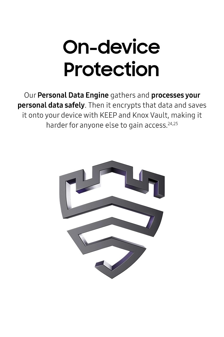 24The Personal Data Engine functions under the condition that the Personal Data Intelligence menu is on. Analysed data will be deleted once the Personal Data Intelligence menu is turned off. Personal Data Engine recognises select languages and certain accents/dialects, including but not limited to Arabic, (Simplified) Chinese, Dutch, English, French, German, Hindi, Indonesian, Italian, Japanese, Korean, Polish, Portuguese, Romanian, Russian, Spanish, Swedish, Thai, Turkish, and Vietnamese. Personal Data Engine currently analyses Samsung native applications and supported app notifications.