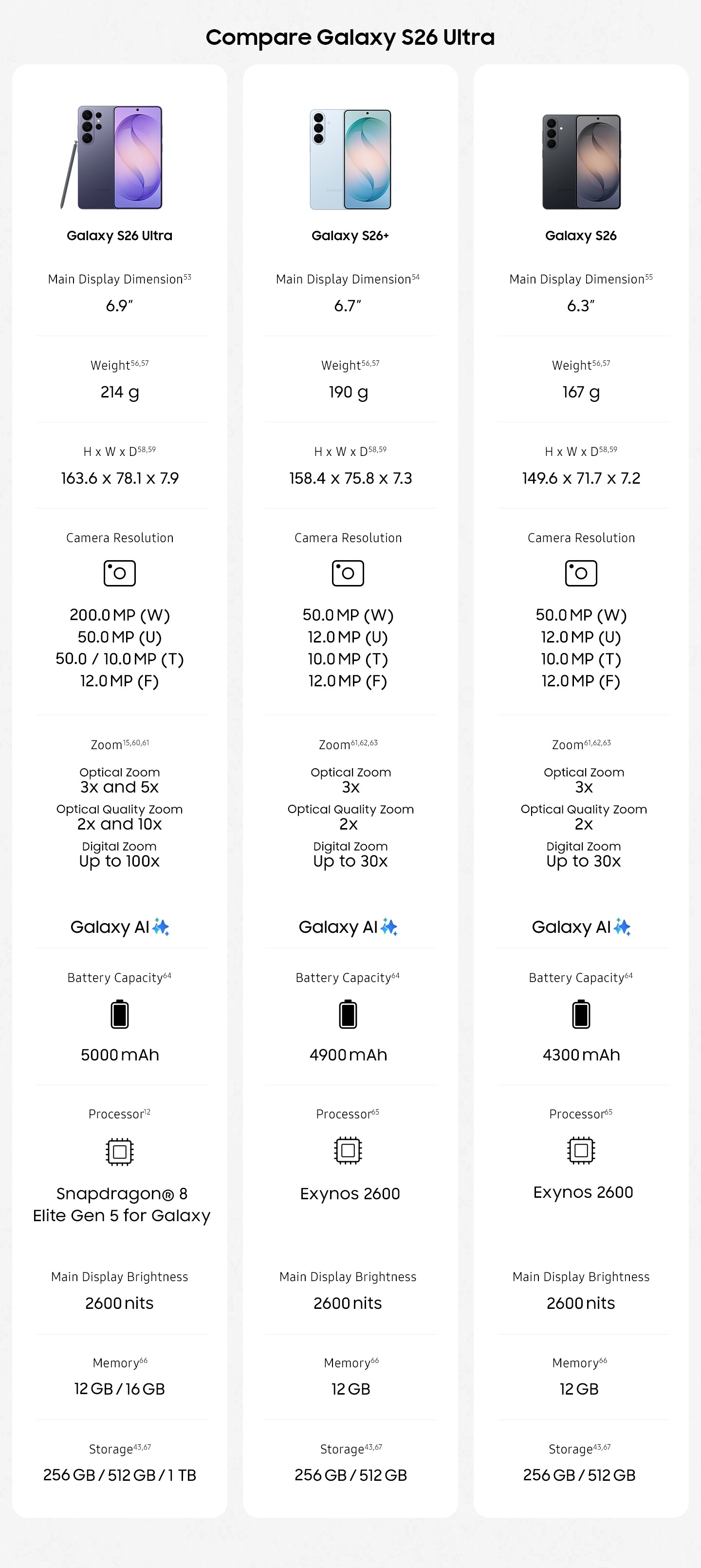 53Measured diagonally, Galaxy S26 Ultra’s Main Screen size is 6.9” in the full rectangle and 6.7” accounting for the rounded corners; actual viewable area is less due to the rounded corners.