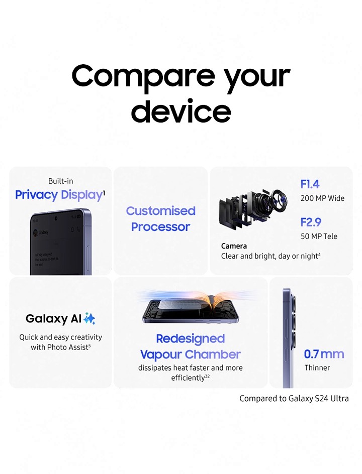 13Vapour Chamber performance improvements shown compared to Galaxy S25 Ultra. Actual performance will depend on user environment, conditions and pre-installed software and applications.