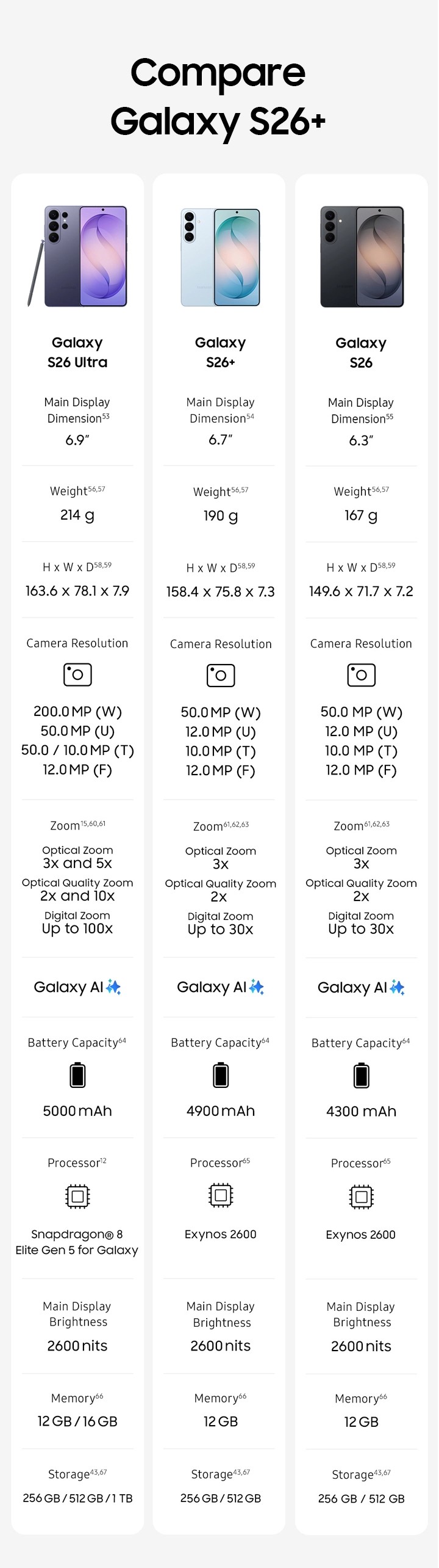 64Typical value tested under third-party laboratory condition. Typical value is the estimated average value considering the deviation in battery capacity among the battery samples tested under IEC 61960 standard. Rated capacity is 4175 mAh for Galaxy S26, 4755 mAh for Galaxy S26+ and 4855 mAh for Galaxy S26 Ultra. Actual battery life varies by network environment, features and apps used, frequency of calls and messages, the number of times charged, and many other factors. Estimated against the average usage profile compiled by UX Connect Research. Independently assessed by UX Connect Research between 2026.1.8–2026.1.30 in US and UK with pre-release versions of SM-S942, SM-S947 and SM-S948 under default setting using LTE and 5G Sub6 networks. NOT tested under 5G mmWave network.