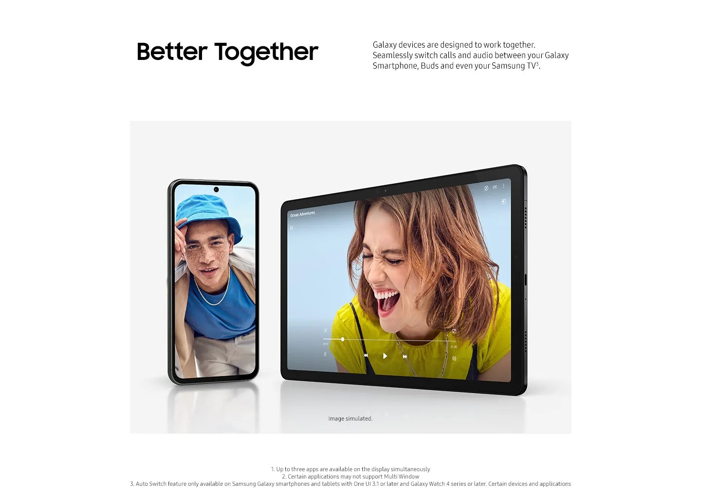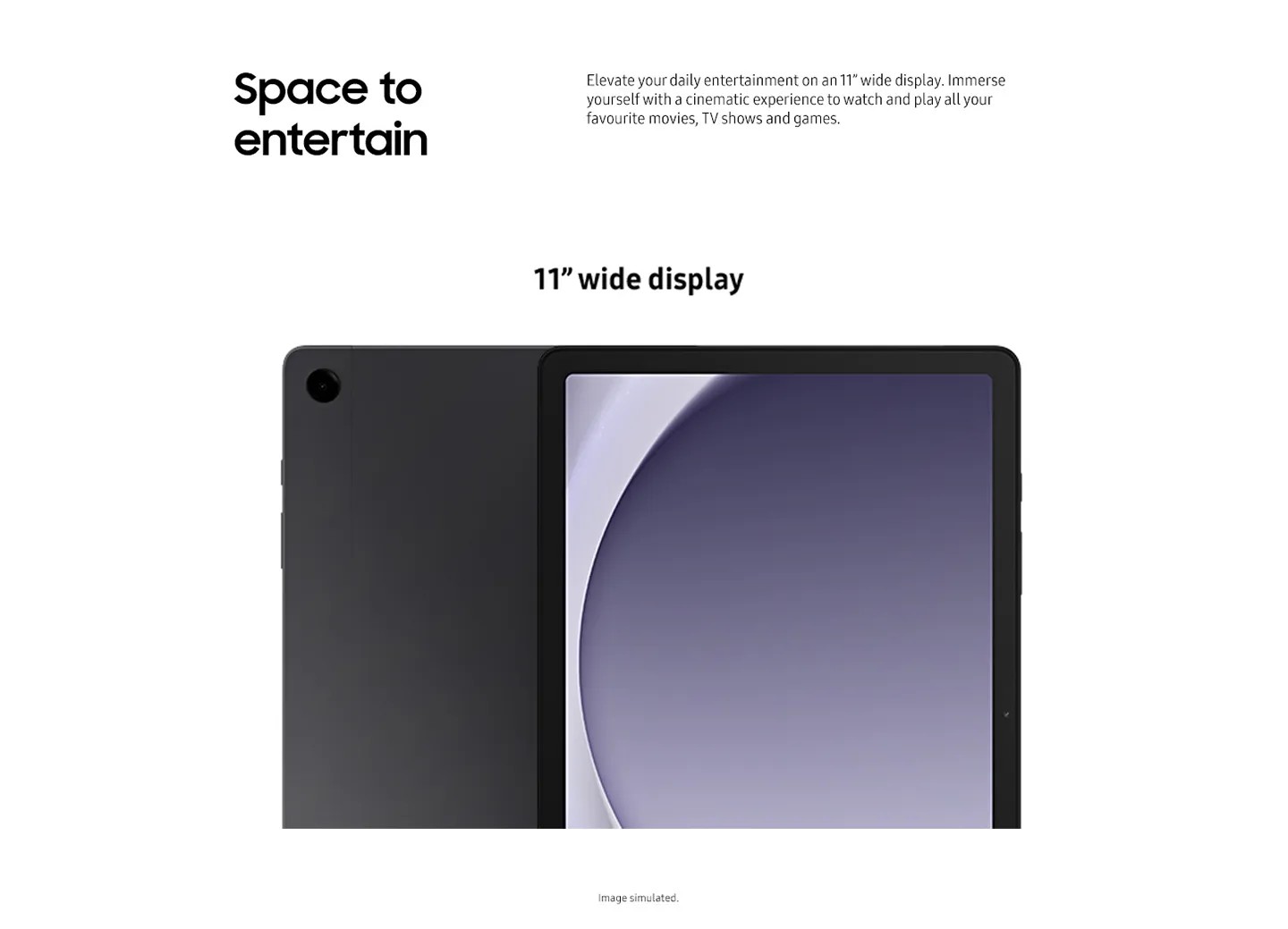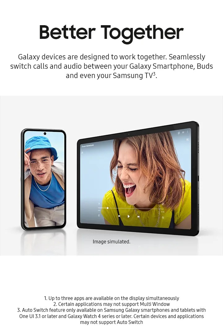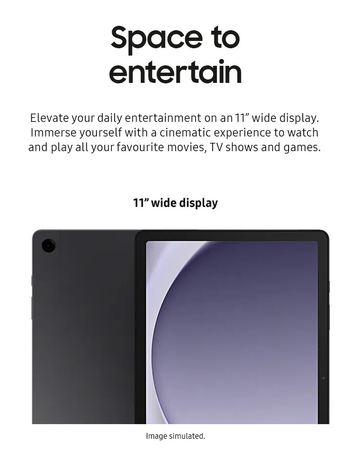 Combining exceptional performance with epic convenience, the Galaxy Tab A9+ 5G lets you work, watch and create how you want, wherever you want. Enjoy a truly immersive cinema and gaming experience with vivid colours and super-smooth visuals on the Full HD+ 11" display. Multitask with ease by running up to three apps all at the same time thanks to the Multi Window feature. Designed for seamless integration with other Galaxy devices, you can easily switch calls and audio between your Galaxy Smartphone, Buds and even your Samsung TV.
