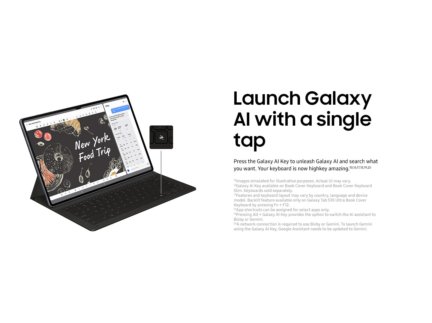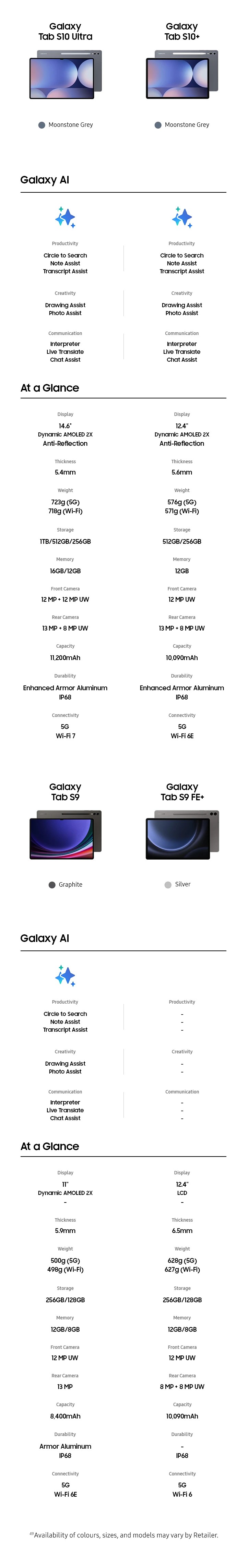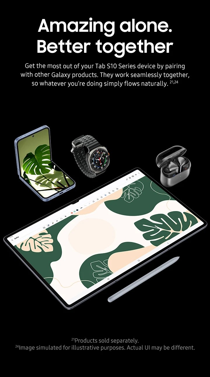 Reach new dimensions of productivity and creativity with the Galaxy Tab S10 Ultra powered by Galaxy AI. Transform your notetaking with Note Assist and bring out your artistic side with Sketch to Image. Enjoy sharp, glare-free visuals on an anti-reflective display, premium performance and long-lasting battery life. Built with enhanced durability, this water and dust-resistant device comes pre-loaded with pro-grade apps like Clip Studio Paint, Lumafusion, and Goodnotes, perfect for creative and productive trailblazers in any setting.