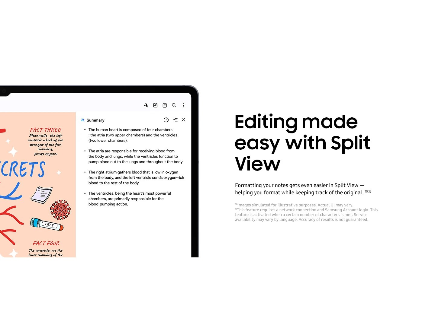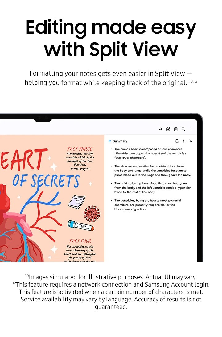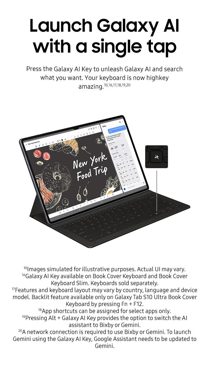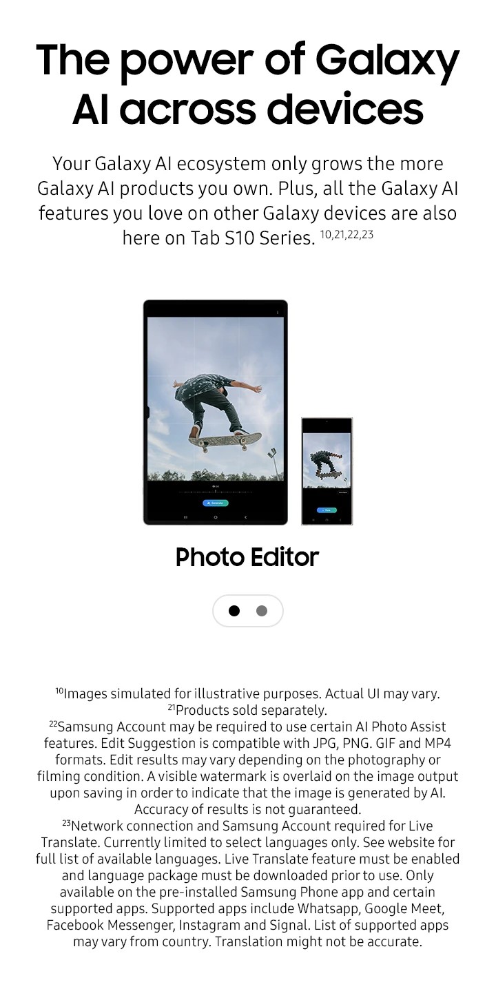 Reach new dimensions of productivity and creativity with the Galaxy Tab S10 Ultra powered by Galaxy AI. Transform your notetaking with Note Assist and bring out your artistic side with Sketch to Image. Enjoy sharp, glare-free visuals on an anti-reflective display, premium performance and long-lasting battery life. Built with enhanced durability, this water and dust-resistant device comes pre-loaded with pro-grade apps like Clip Studio Paint, Lumafusion, and Goodnotes, perfect for creative and productive trailblazers in any setting.